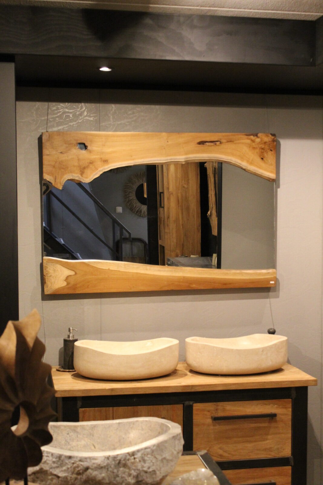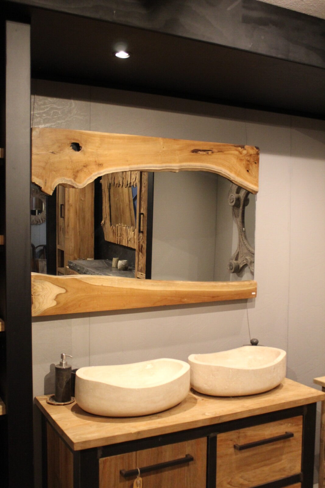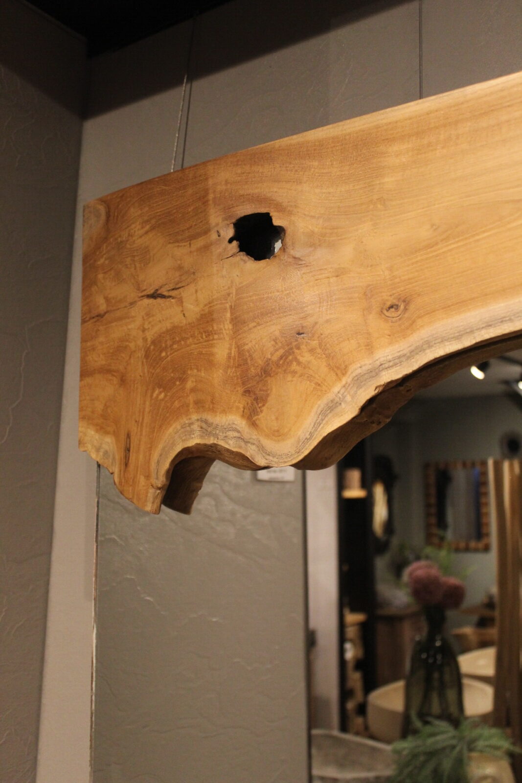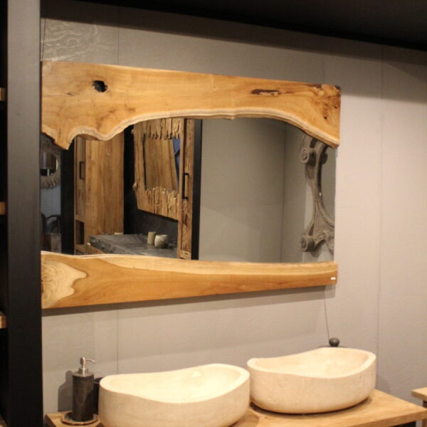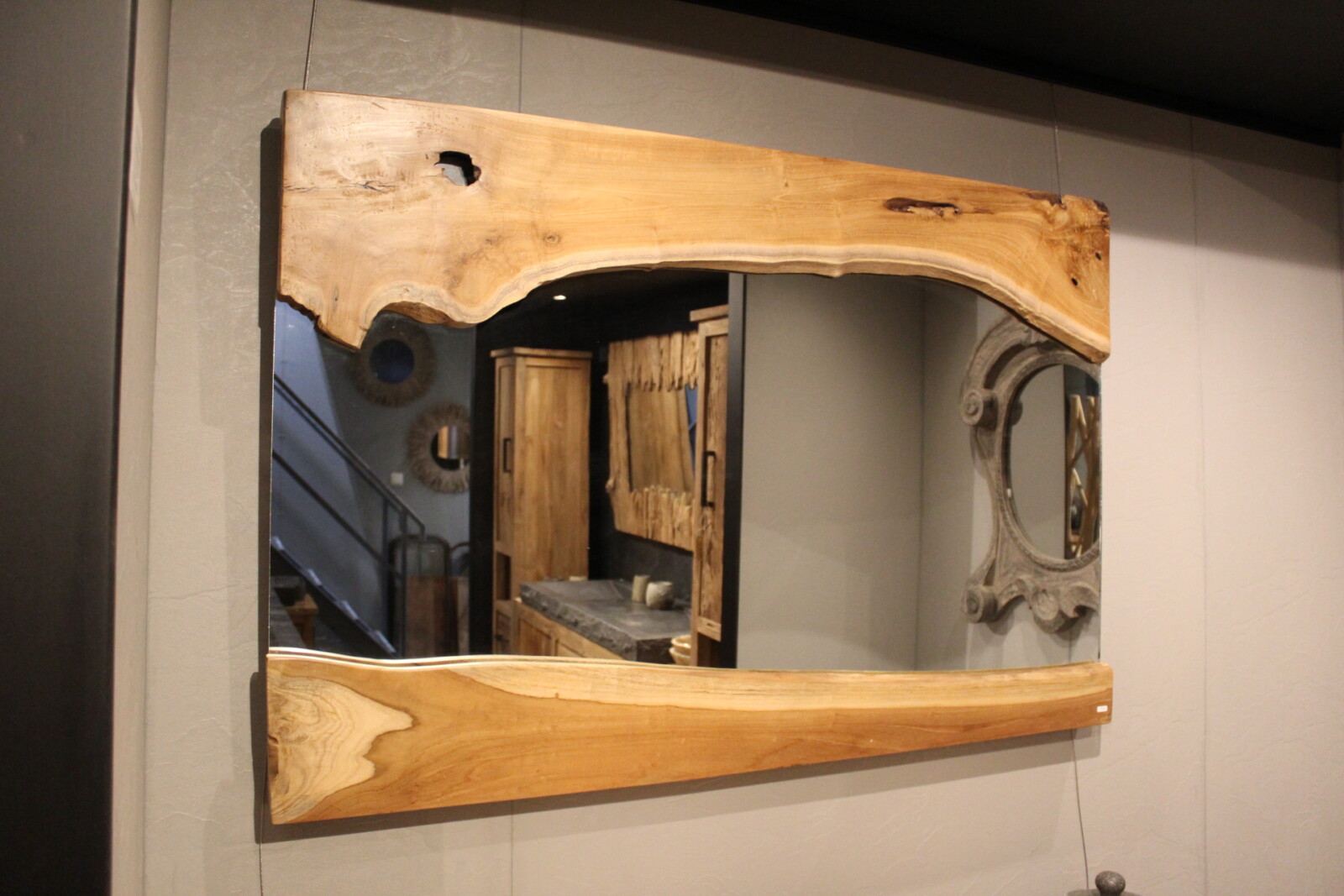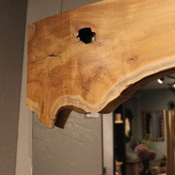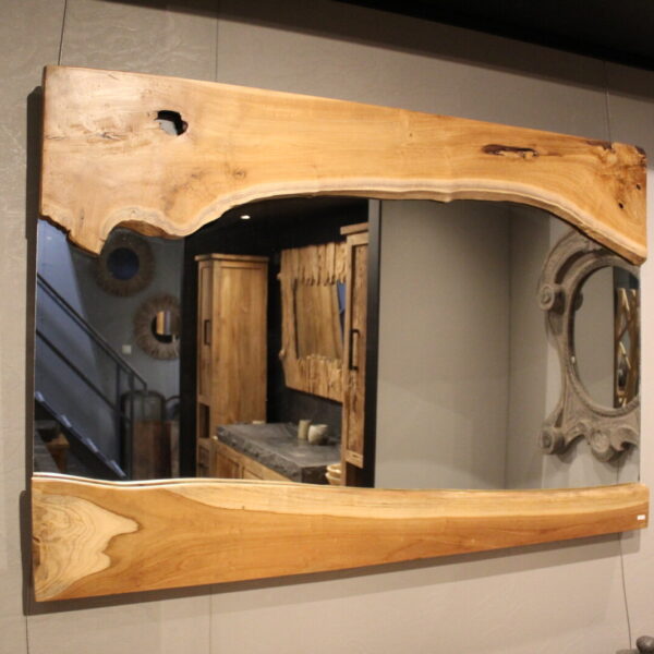 De rand is grof en natuurlijk afgewerkt, waarbij de houtnerf en kleurschakeringen duidelijk zichtbaar blijven. Dit geeft de spiegel een warme en authentieke uitstraling. Geen enkel exemplaar is hetzelfde, wat zorgt voor een exclusief en natuurlijk geheel.