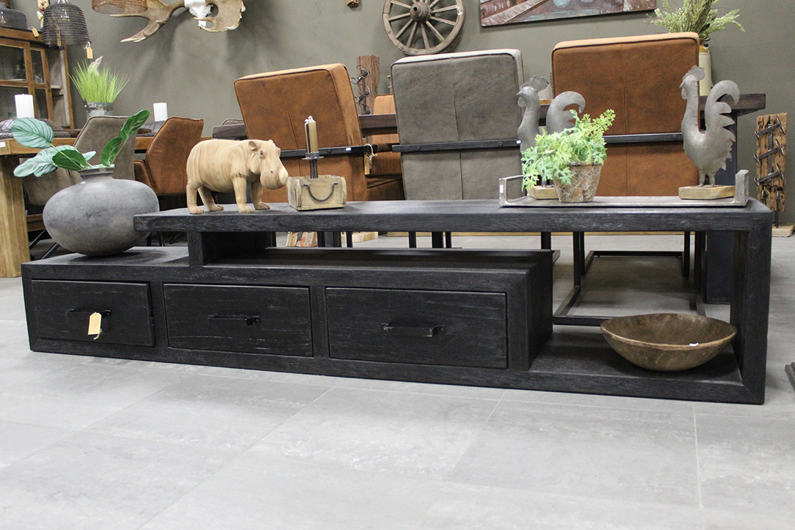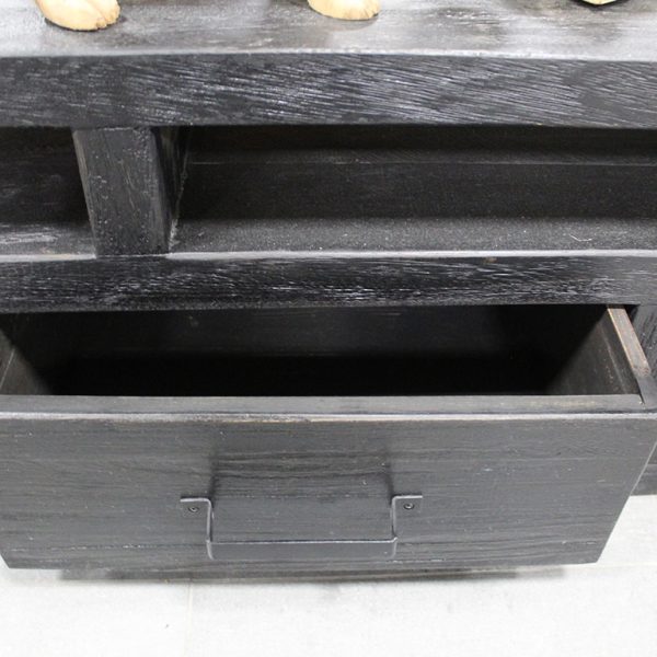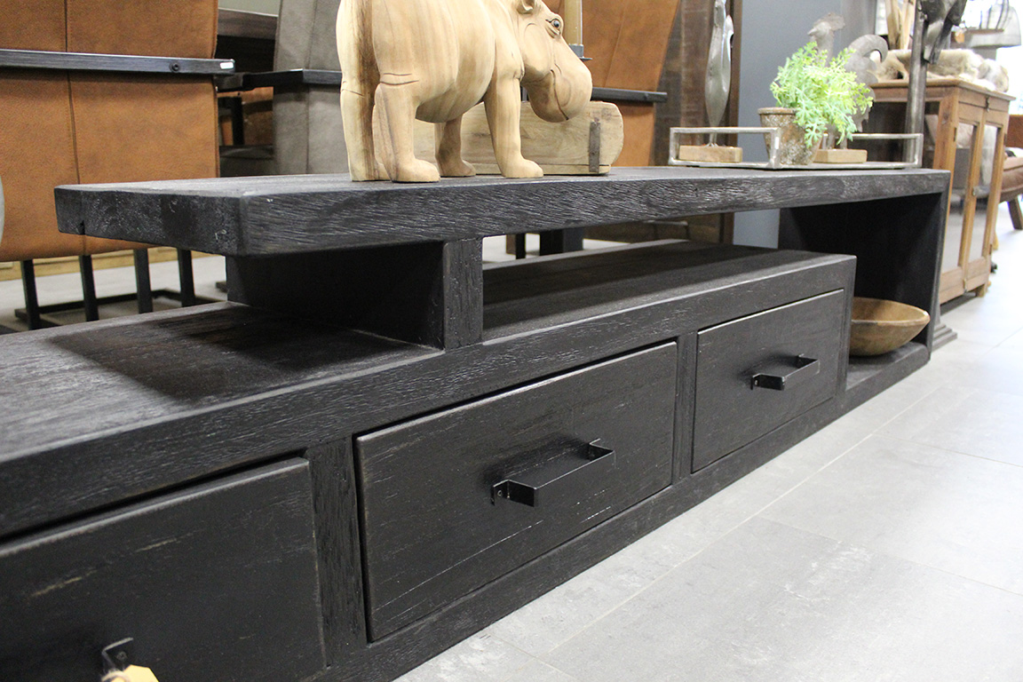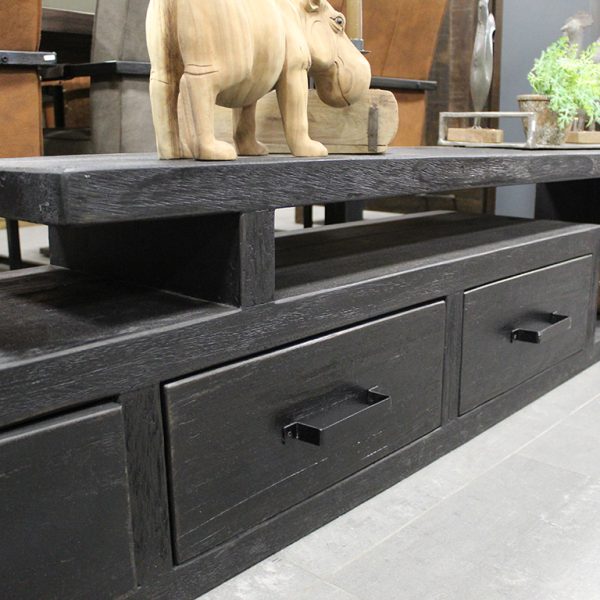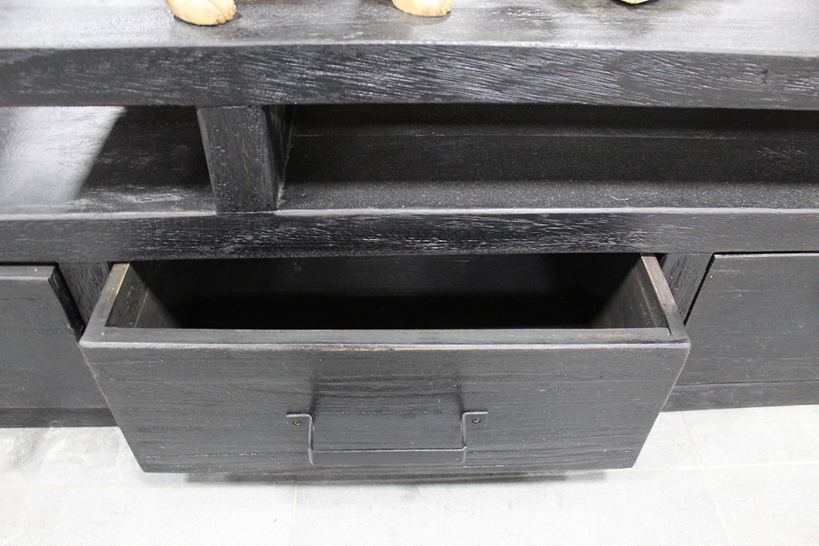 Dit tv meubel is gemaakt van massief teakhout in een zwarte uitvoering.