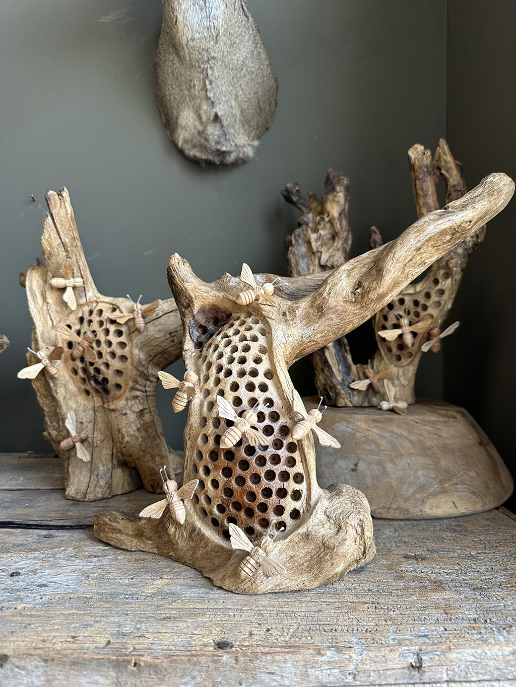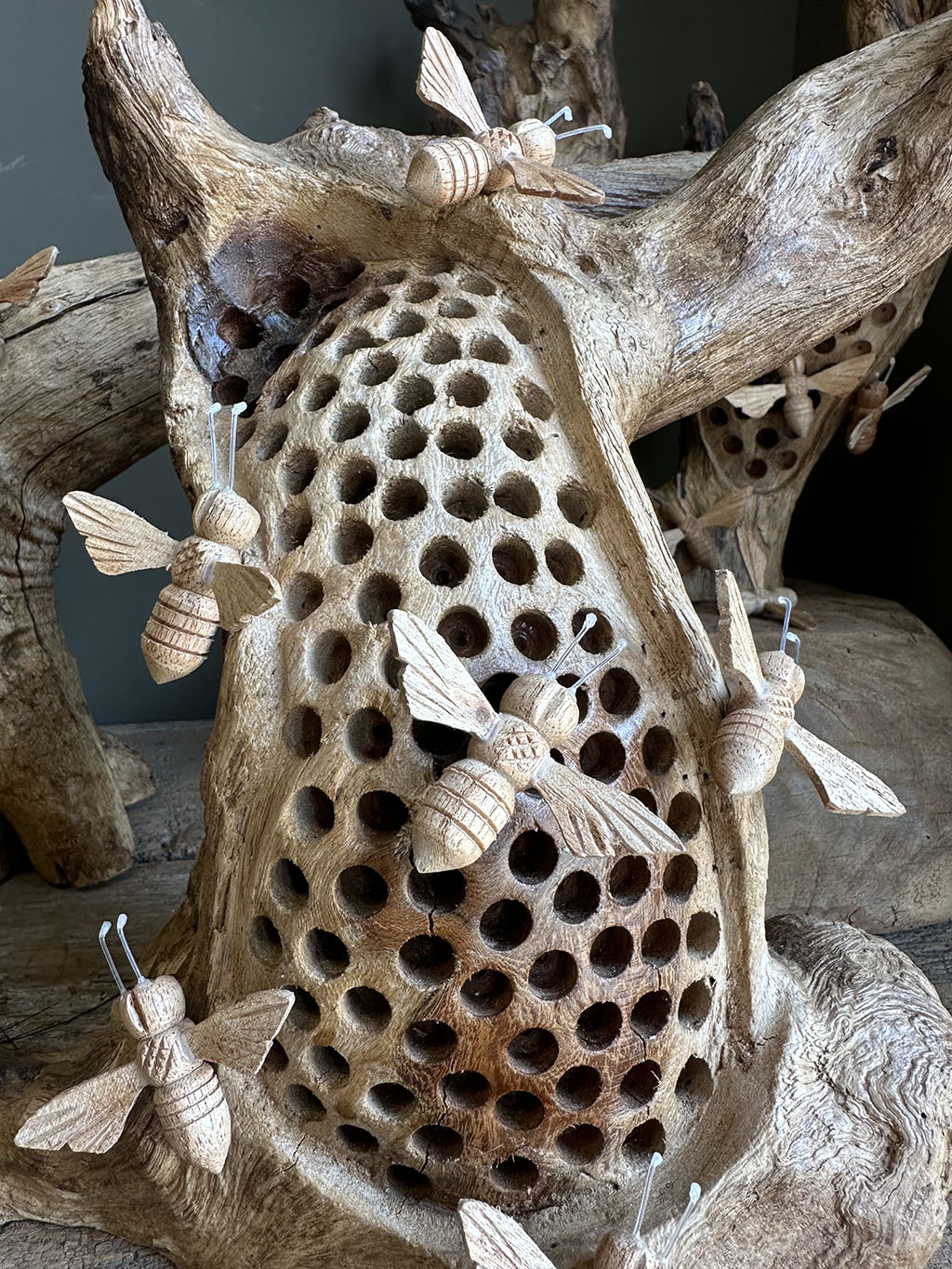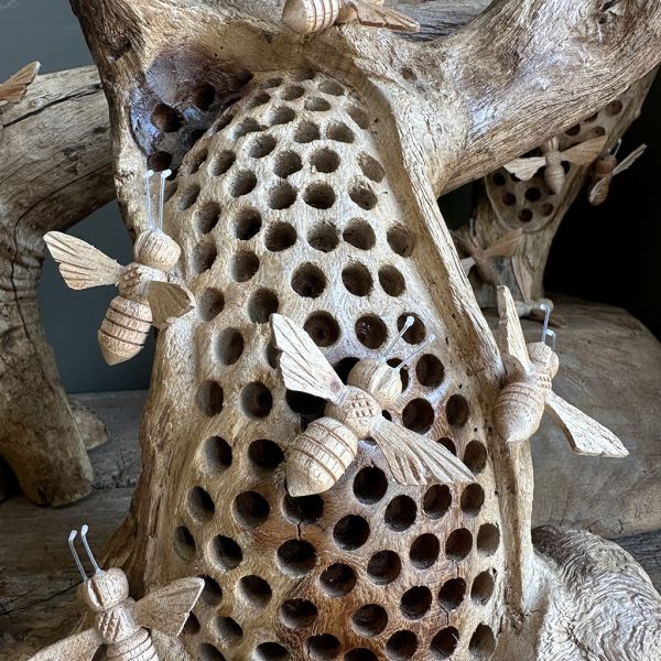 Hoe bijzonder zijn deze grillige houten stronken waarin echte bijenhotels zijn verwerkt. De natuurlijke vorm van het hout geeft elk stuk een robuuste en unieke uitstraling.