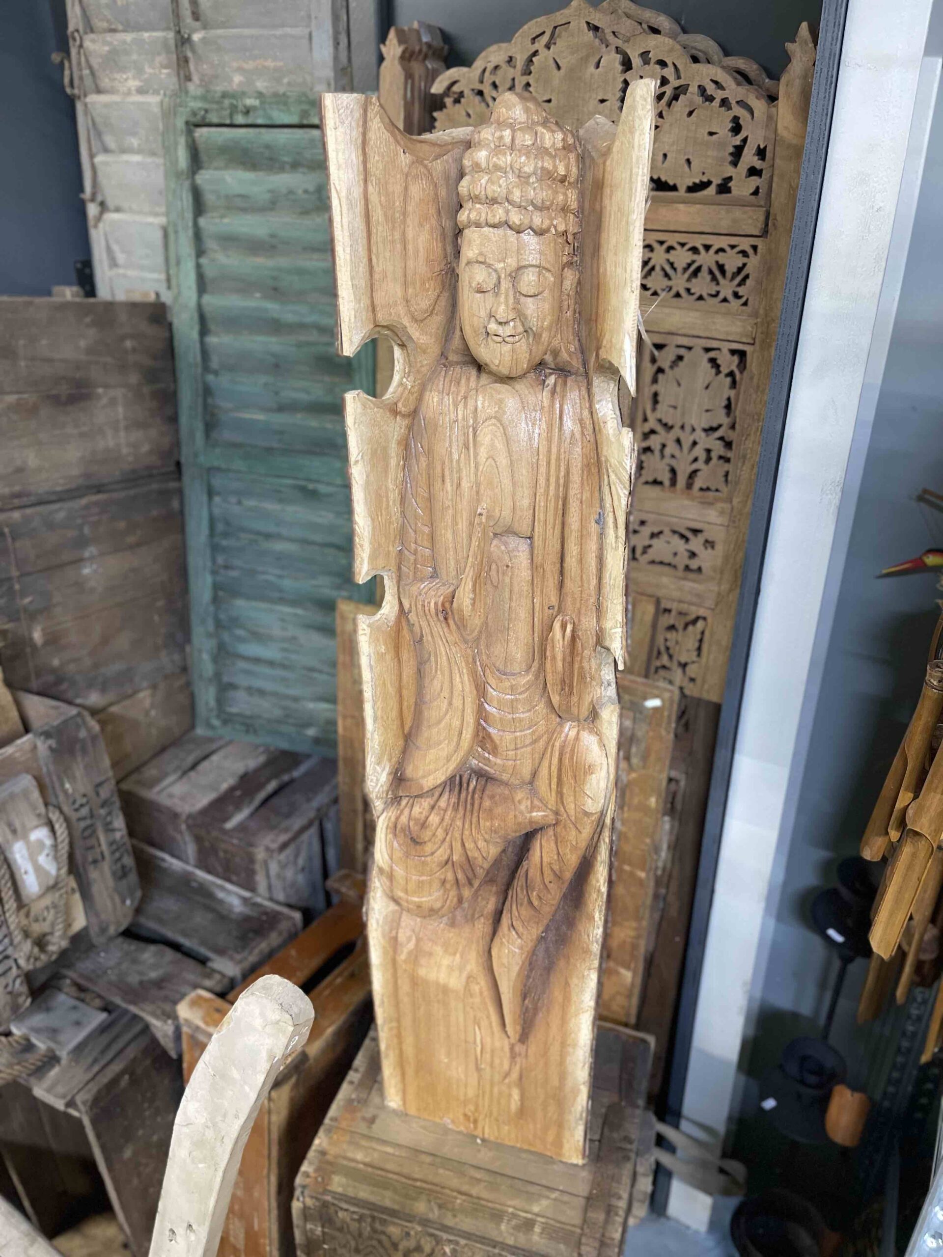 Deze prachtige boeddha in houtwerk XL is met veel zorg uit een stam gesneden.