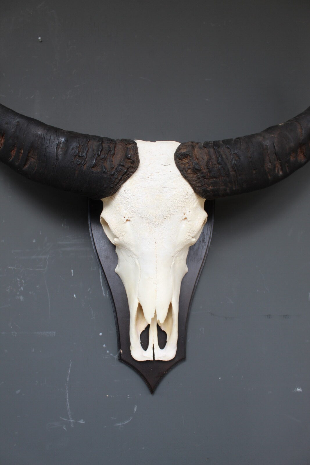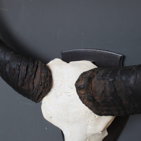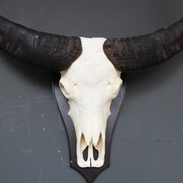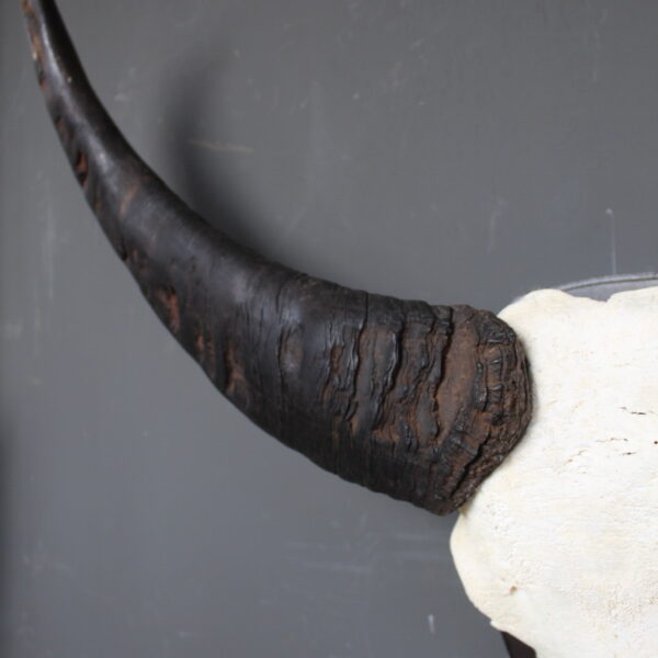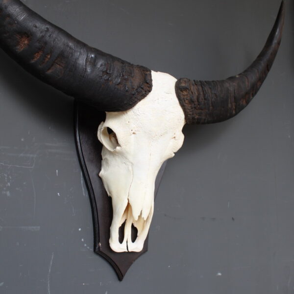 De skull is gemonteerd op een houten schild, wat het geheel een klassieke en stevige basis geeft. Door de imposante vorm en de breed uitlopende hoorns is dit een echte blikvanger die goed tot zijn recht komt in een woonkamer, hal of overdekte buitenruimte.