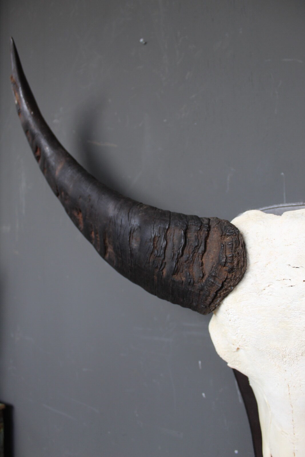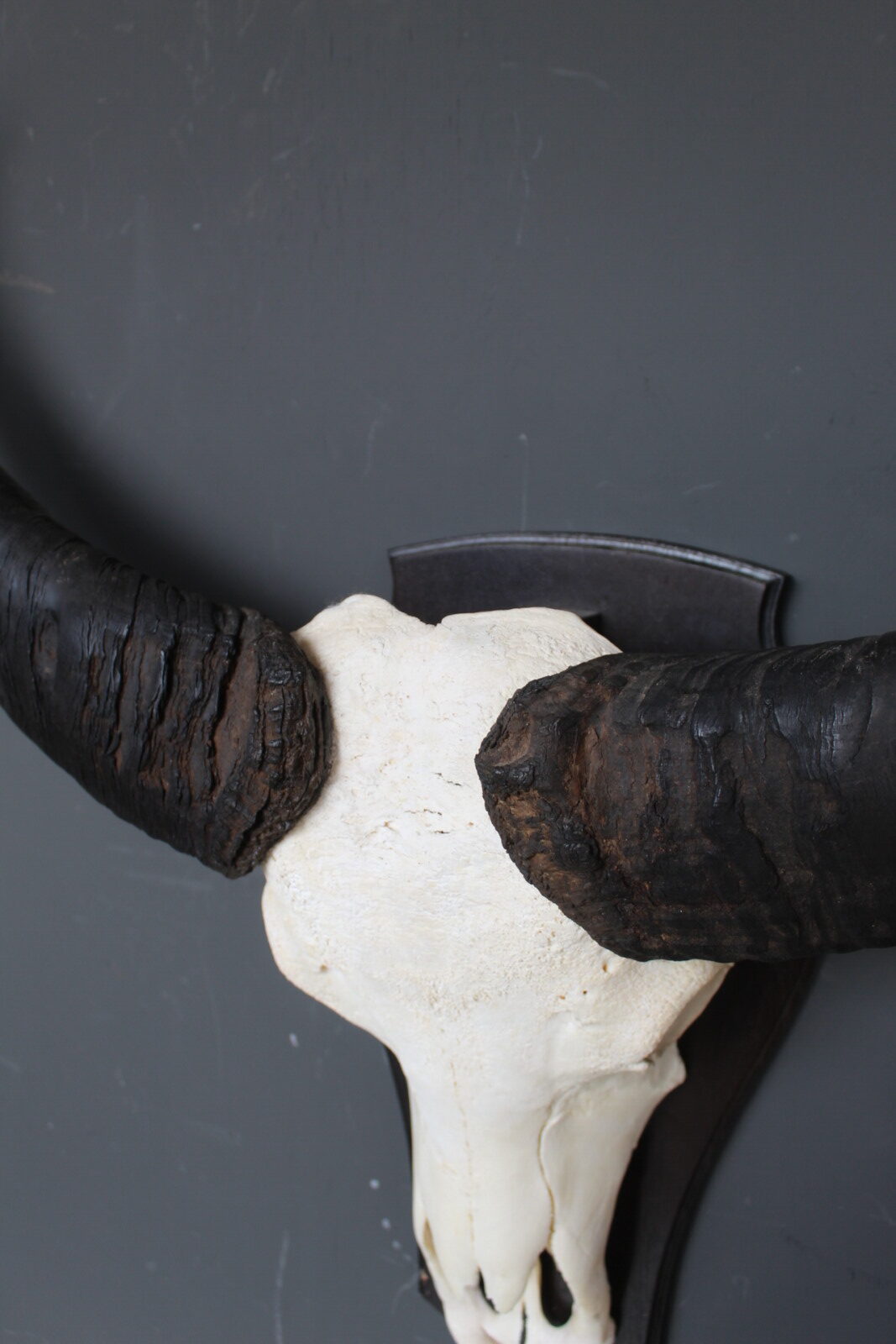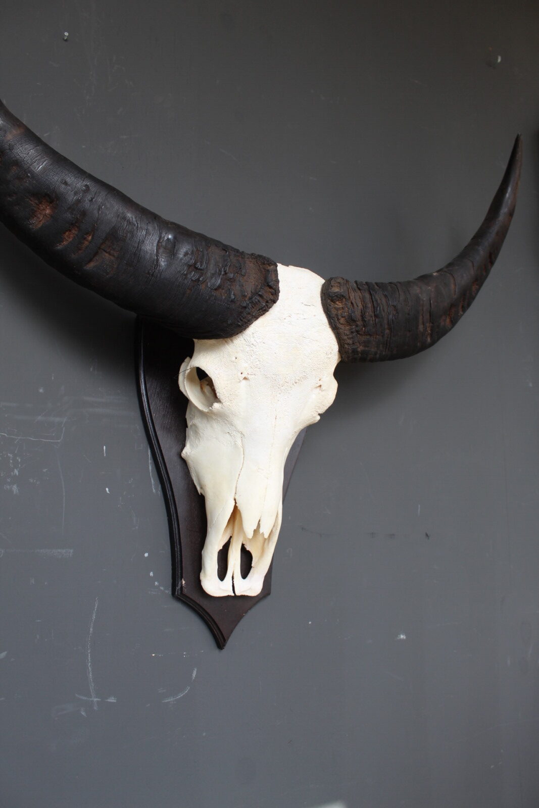 De skull is gemonteerd op een houten schild, wat het geheel een klassieke en stevige basis geeft. Door de imposante vorm en de breed uitlopende hoorns is dit een echte blikvanger die goed tot zijn recht komt in een woonkamer, hal of overdekte buitenruimte.