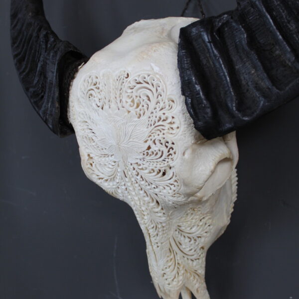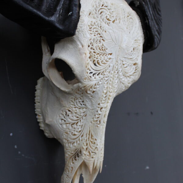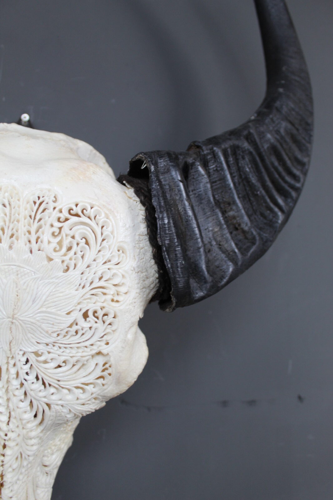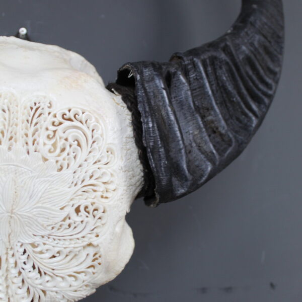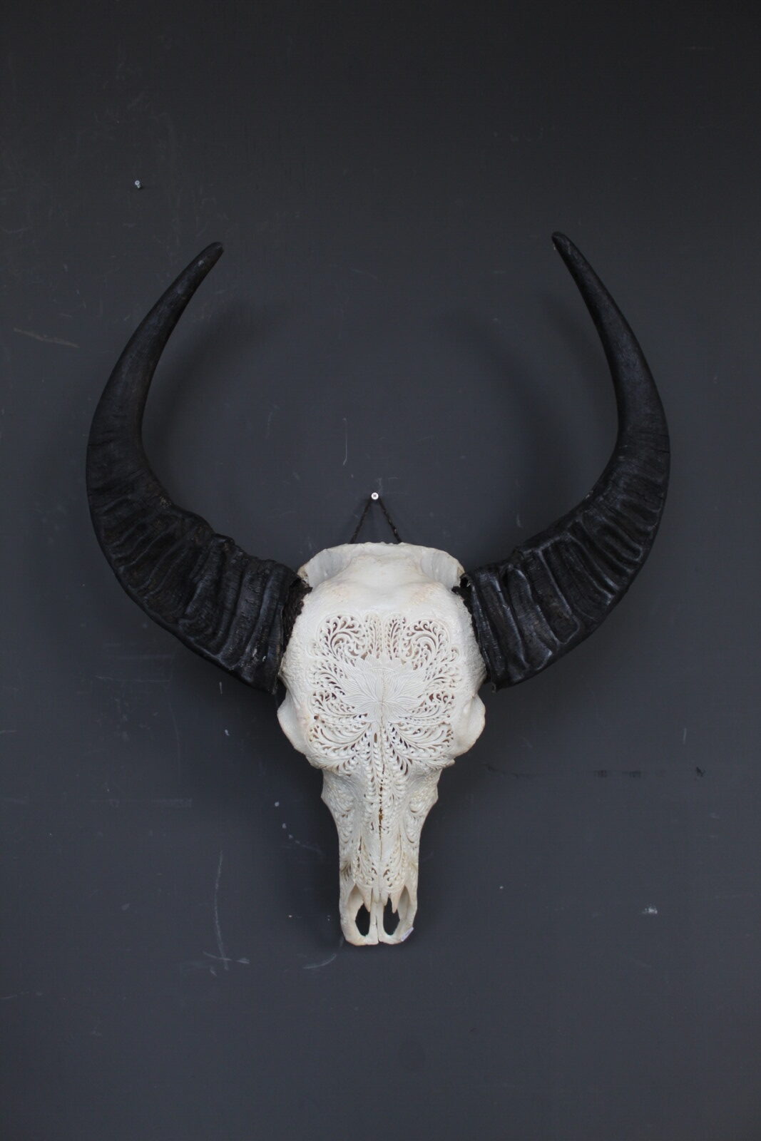 Deze buffel skull onderscheidt zich door het verfijnde, decoratieve patroon in het bot, wat zorgt voor een unieke en bijzondere uitstraling. De combinatie van het lichte, bewerkte oppervlak en de donkere hoorns geeft deze skull een krachtig contrast en een luxe afwerking.