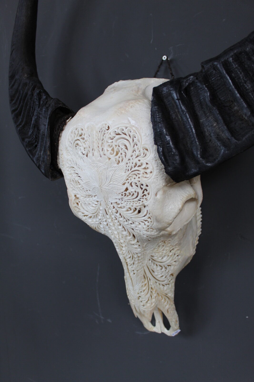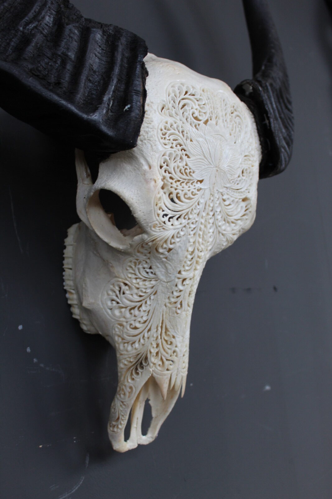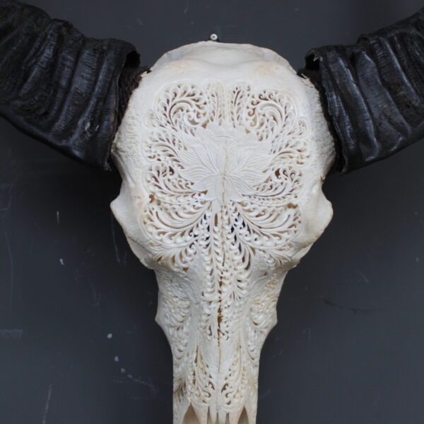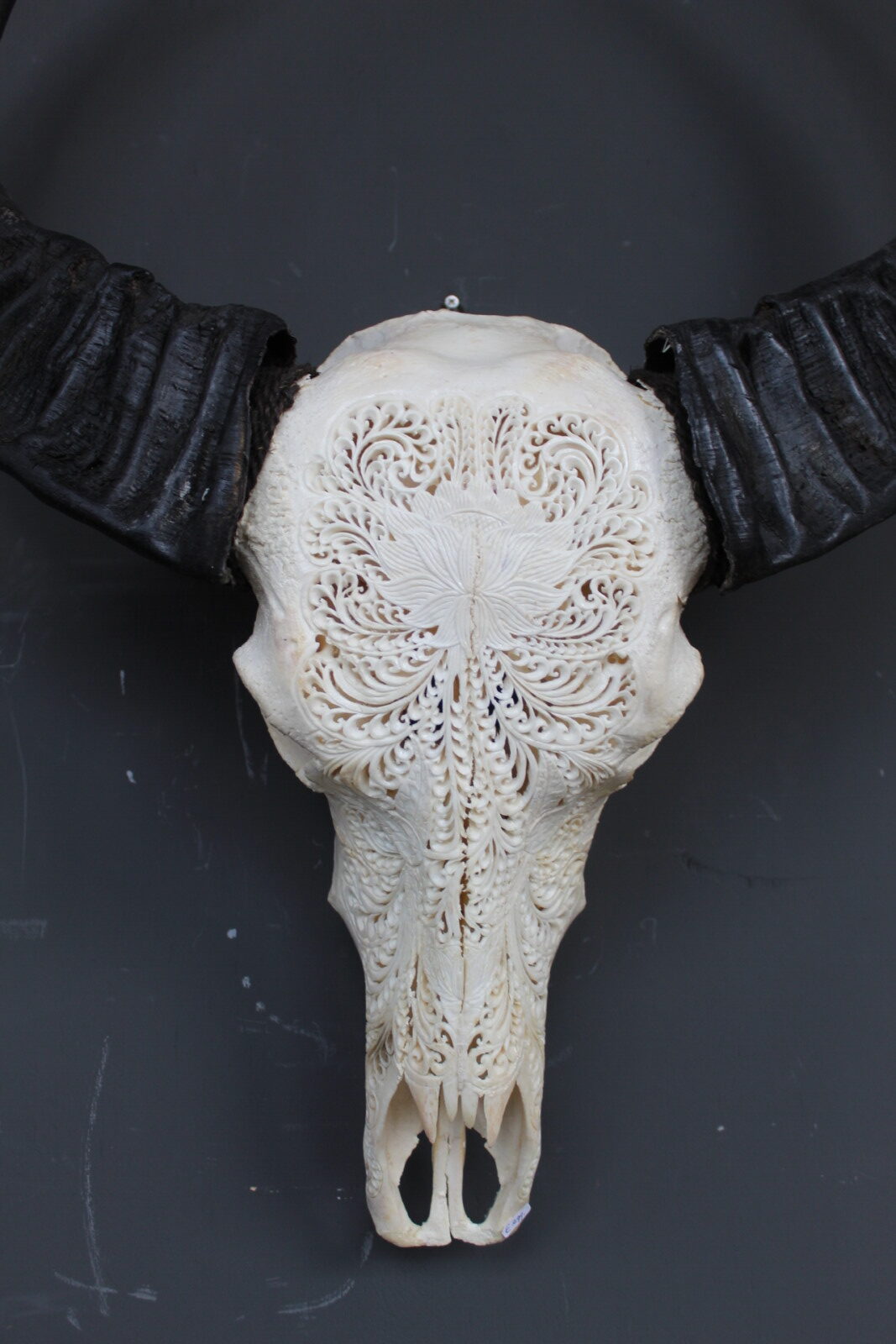 Deze buffel skull onderscheidt zich door het verfijnde, decoratieve patroon in het bot, wat zorgt voor een unieke en bijzondere uitstraling. De combinatie van het lichte, bewerkte oppervlak en de donkere hoorns geeft deze skull een krachtig contrast en een luxe afwerking.