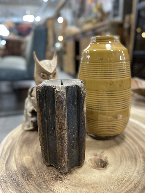 Deze robuuste kaarshouder is gemaakt van oude houten pilaren, wat hem een stoere en karaktervolle uitstraling geeft. Door het hergebruikte hout is ieder exemplaar uniek in kleur en structuur.