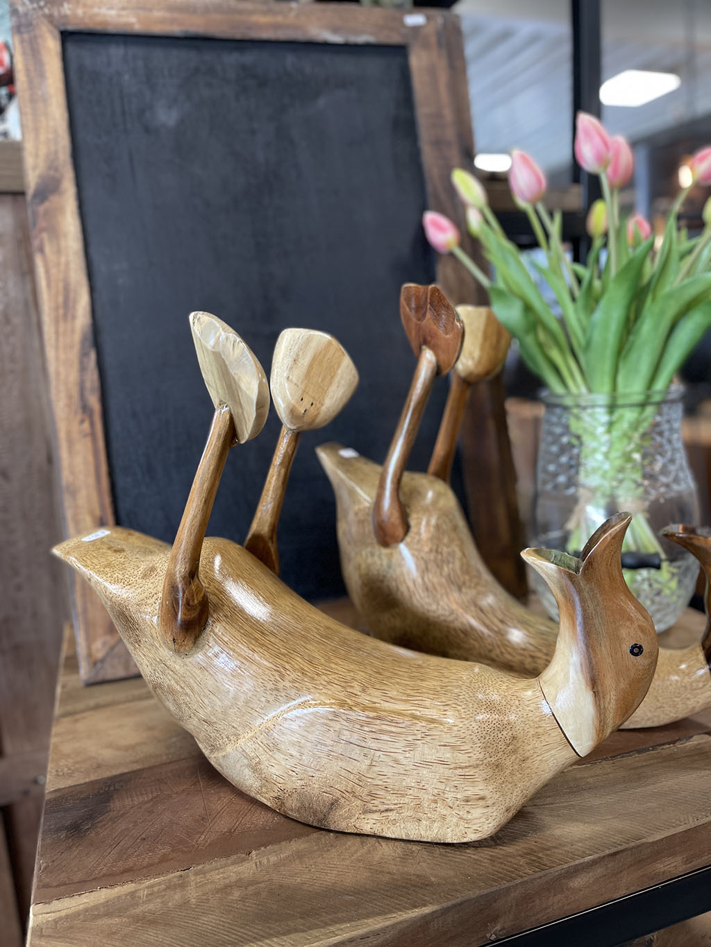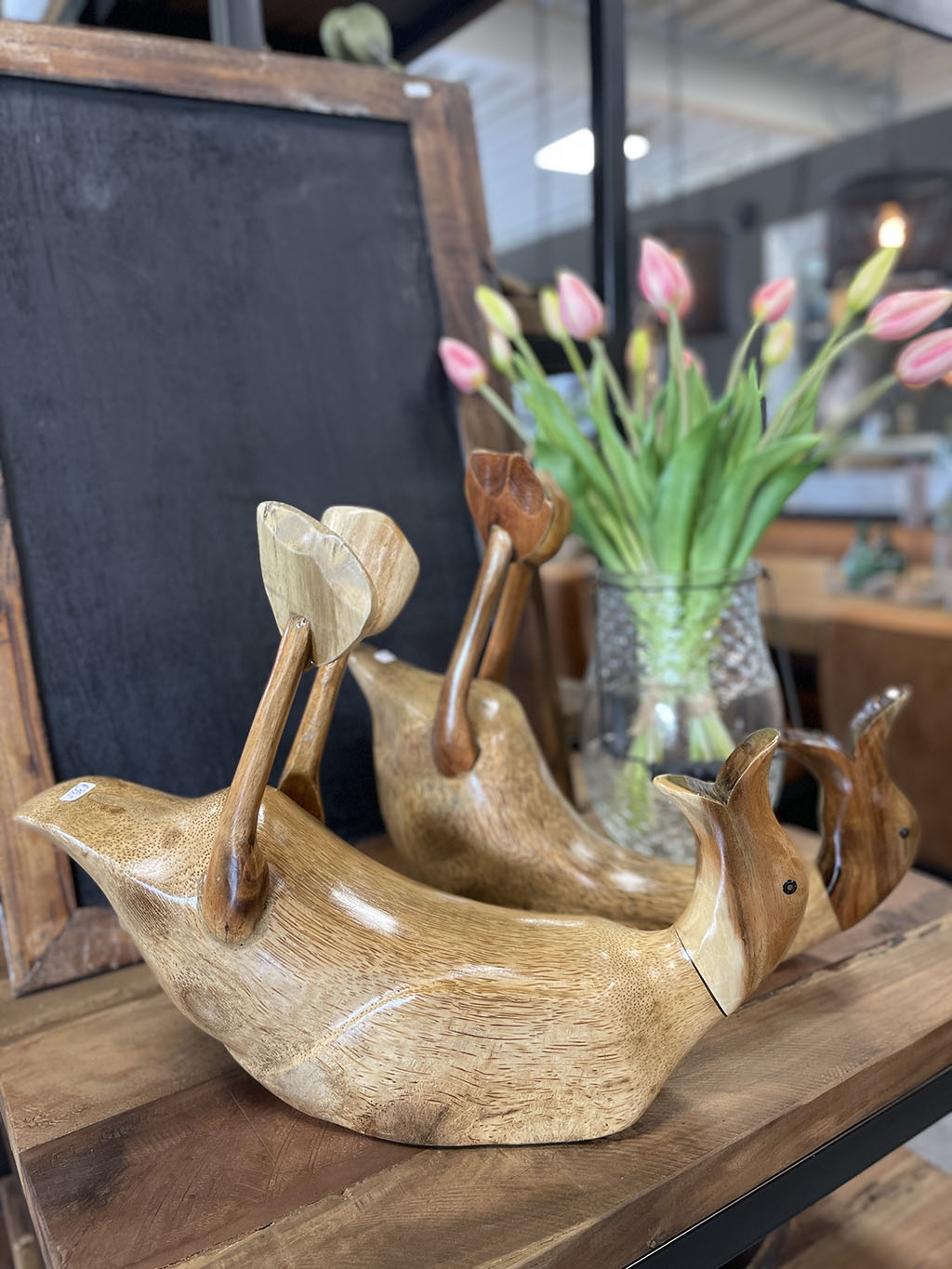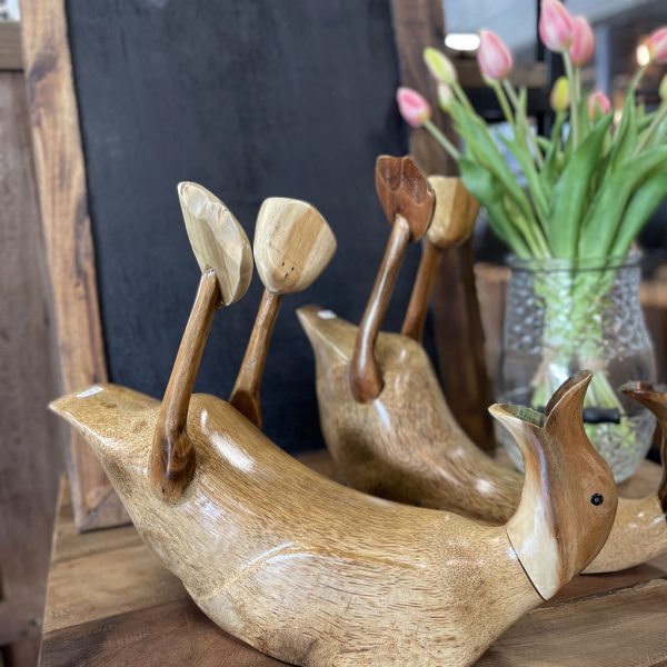 De uit hout gesneden eend ligt op zijn rug en je kunt een lekkere fles wijn of bier tussen zijn pootjes en snavel leggen.