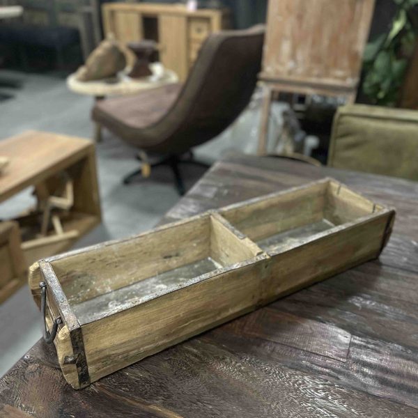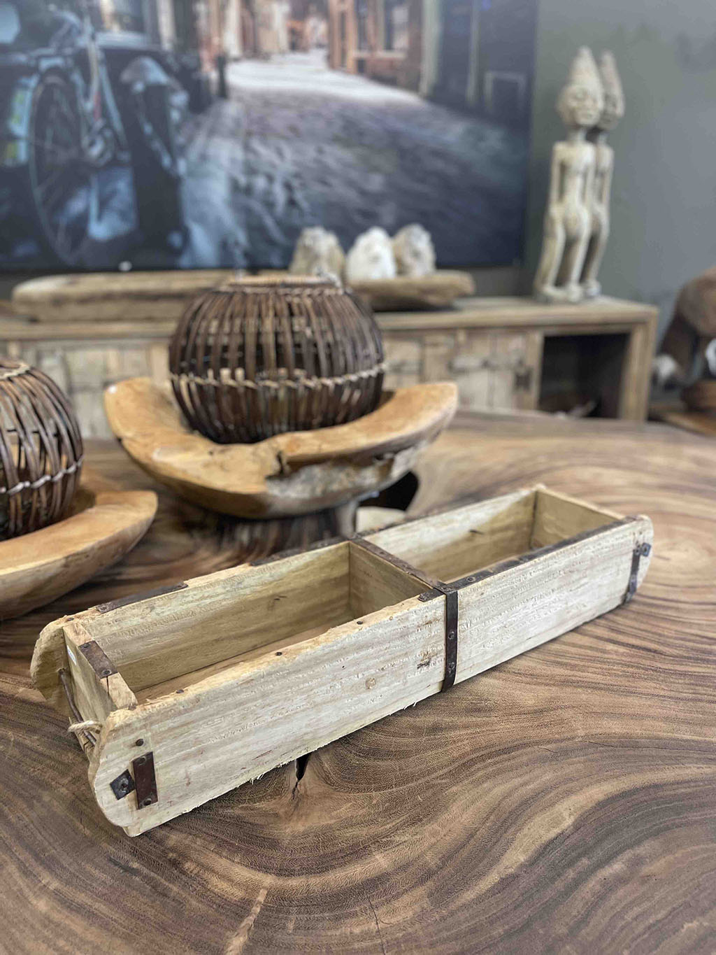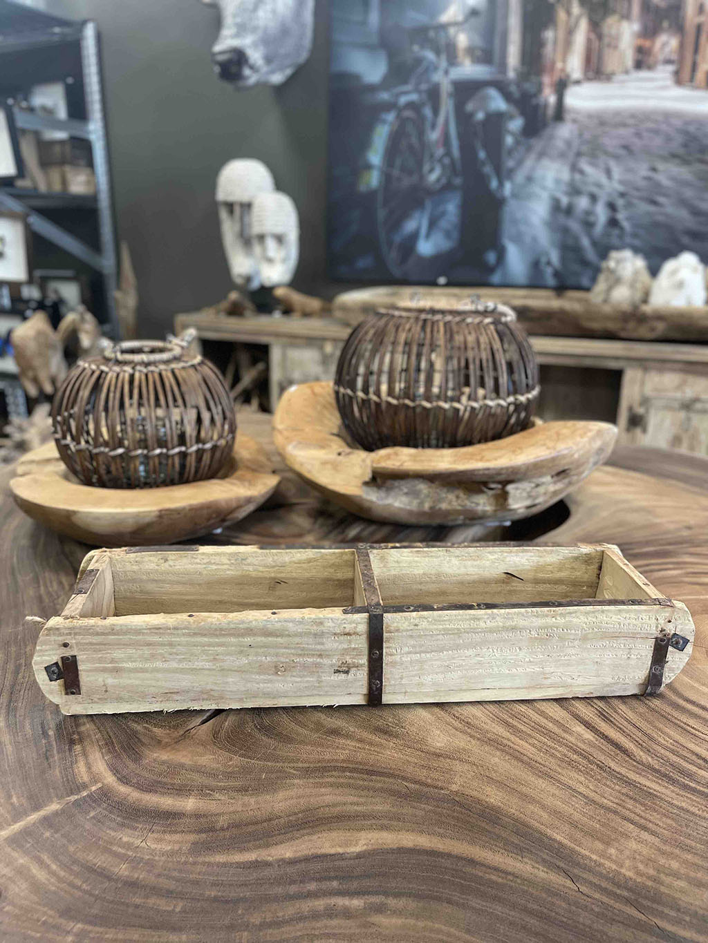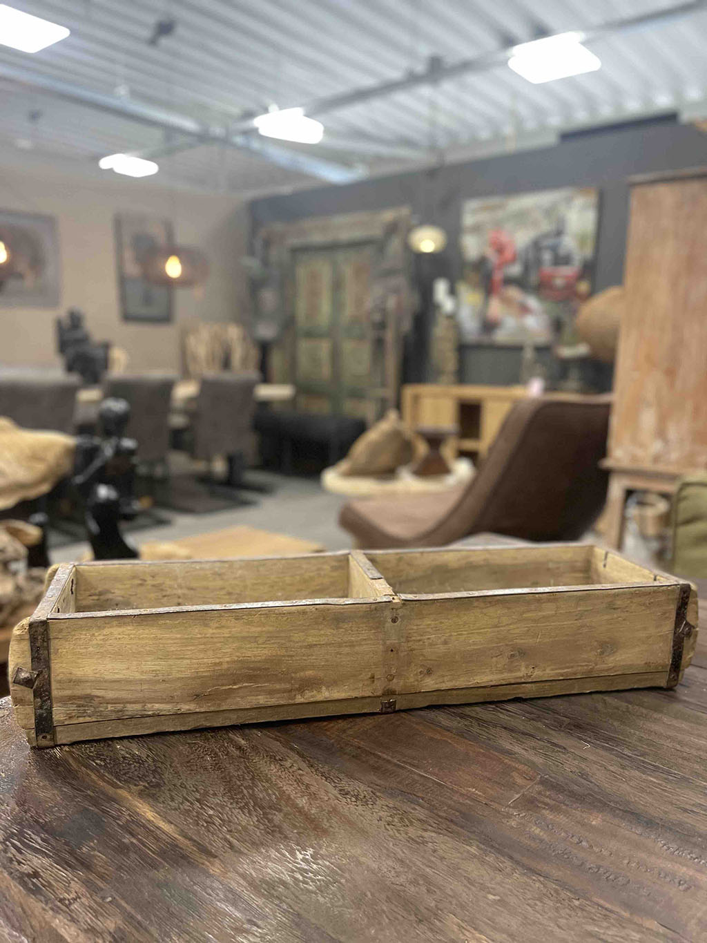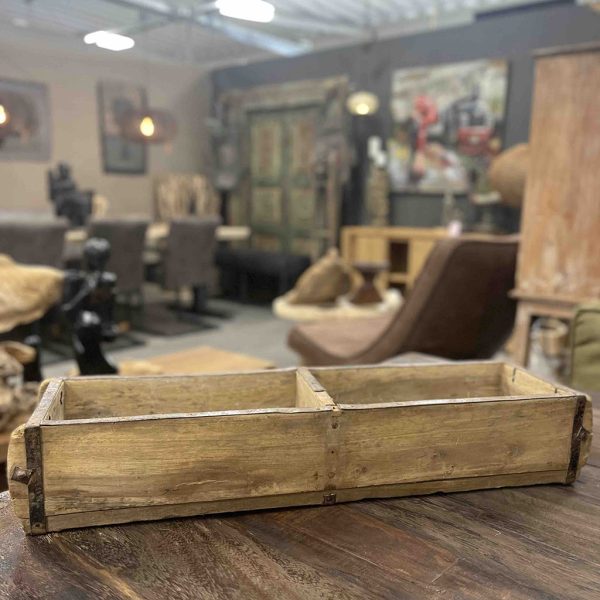 Door zijn authentieke uitstraling combineert hij mooi met andere houten of brocante accessoires. Omdat het om een oud item gaat, kunnen sporen van gebruik zichtbaar zijn — dit geeft iedere steenmal juist zijn unieke karakter.