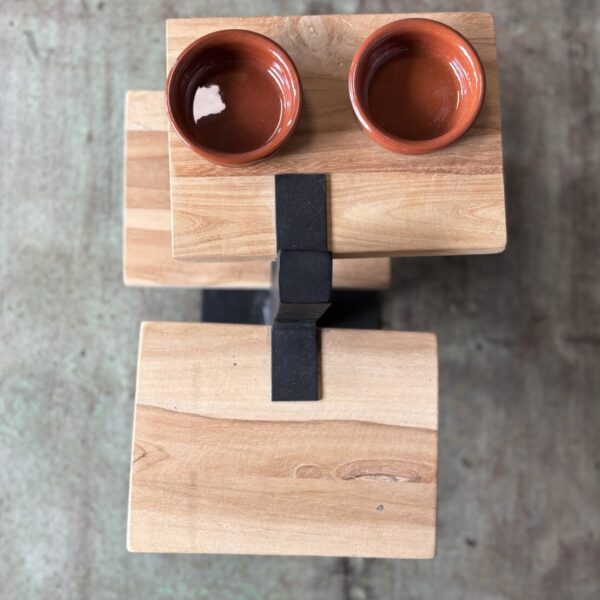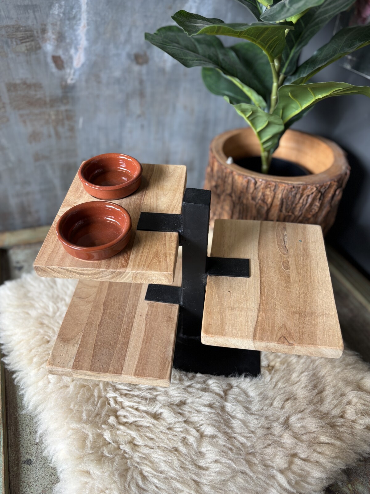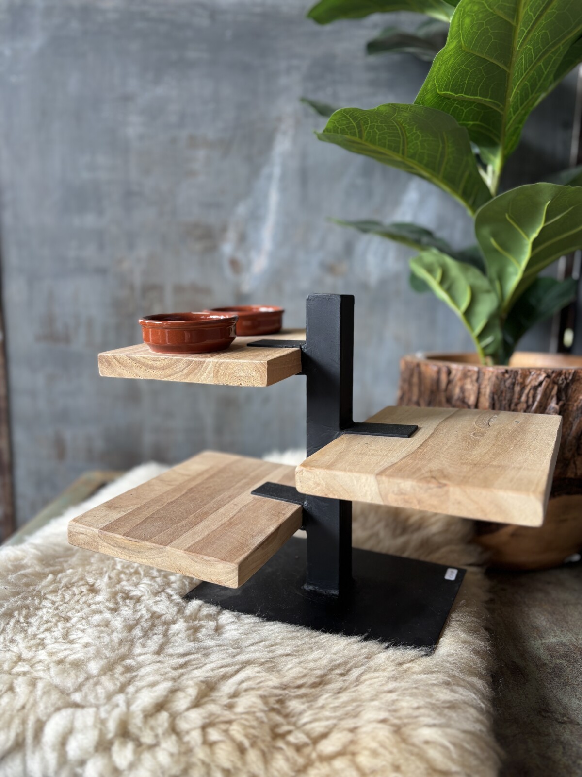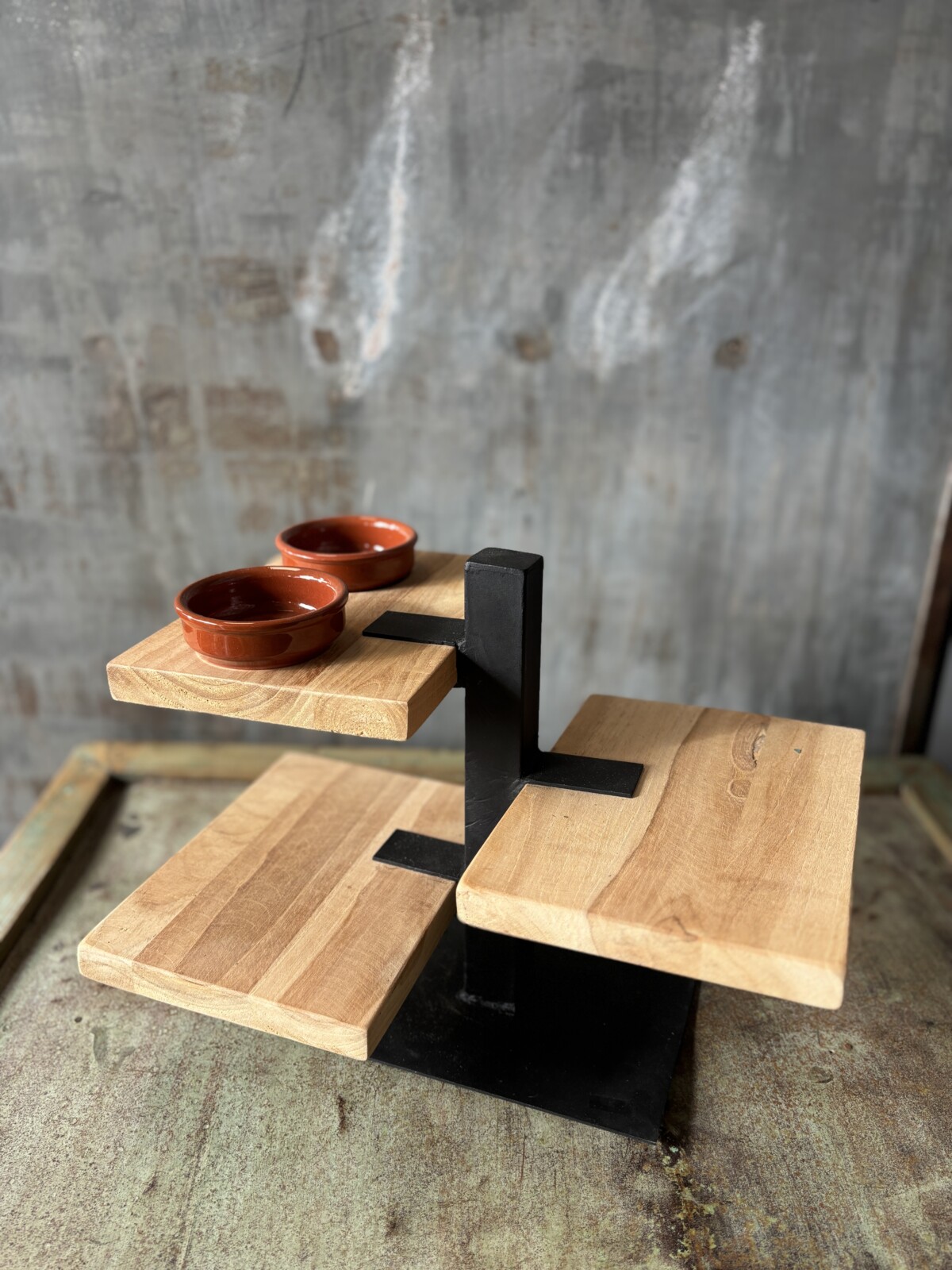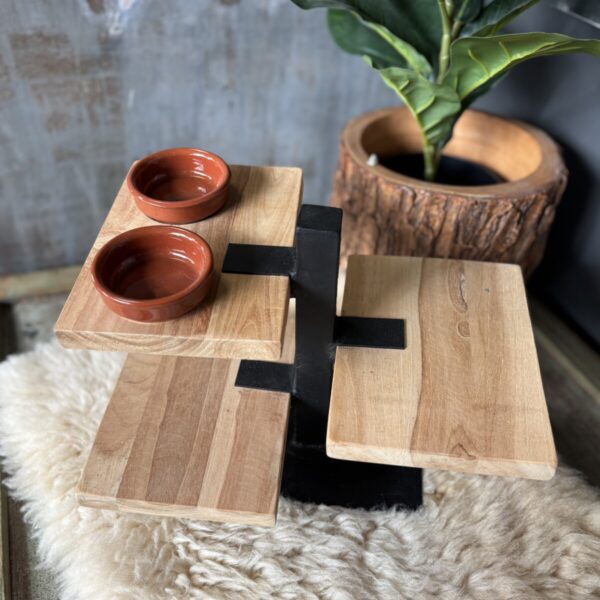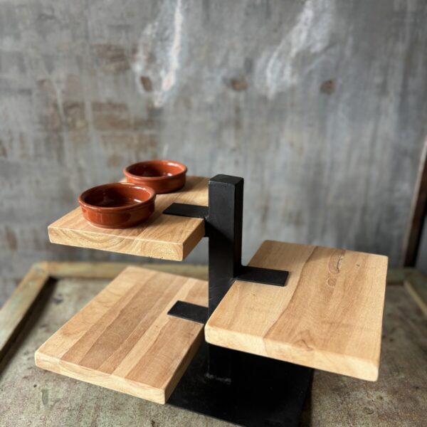 De combinatie van houten planken en een stevig metalen frame zorgt voor een robuuste en tijdloze uitstraling. De etagère biedt voldoende ruimte voor het presenteren van verschillende hapjes, zoals kaas, tapas of kleine snacks.