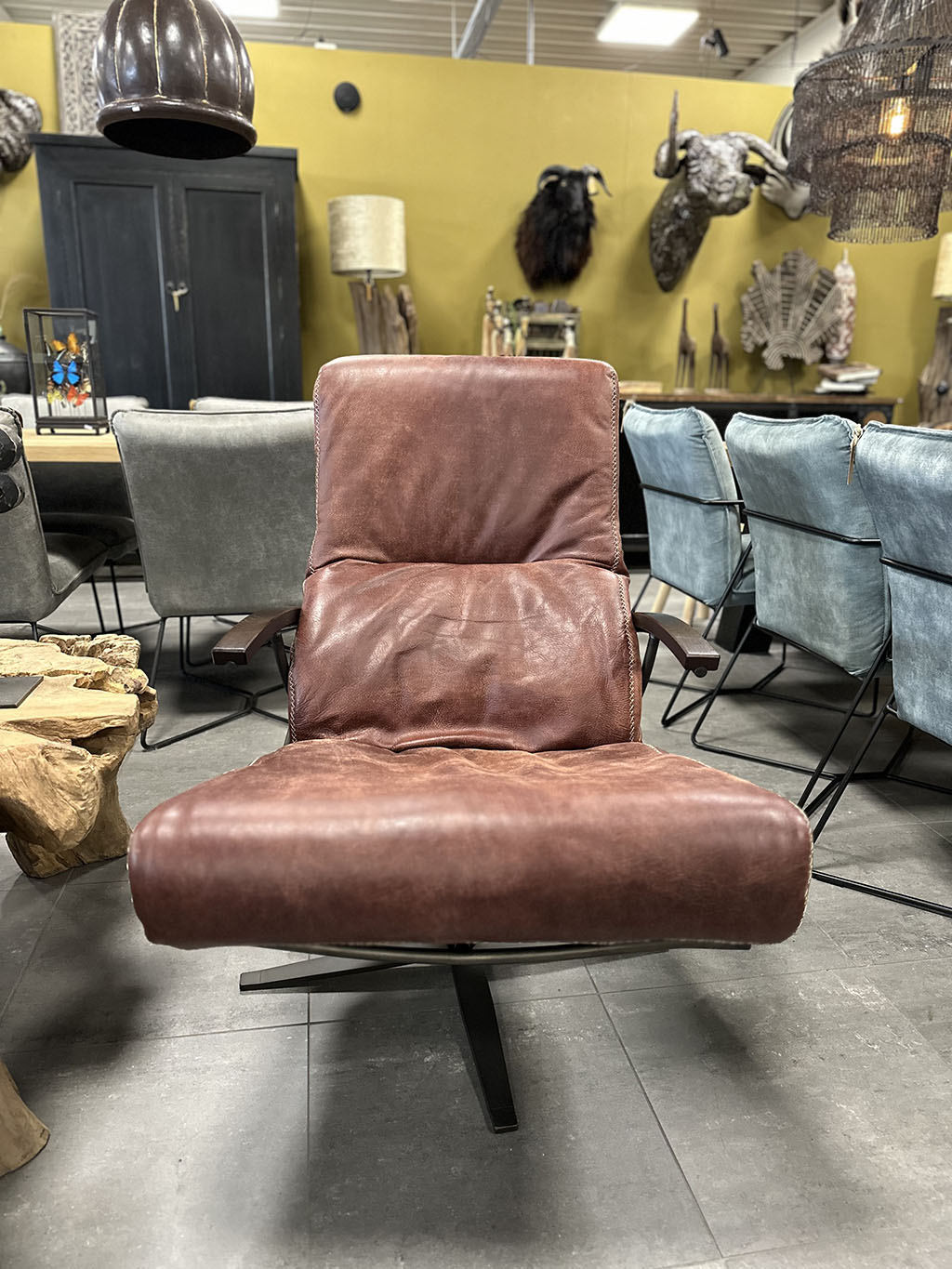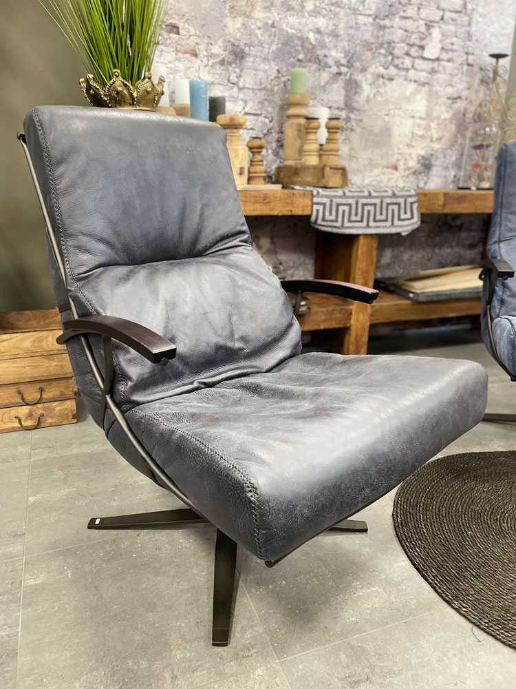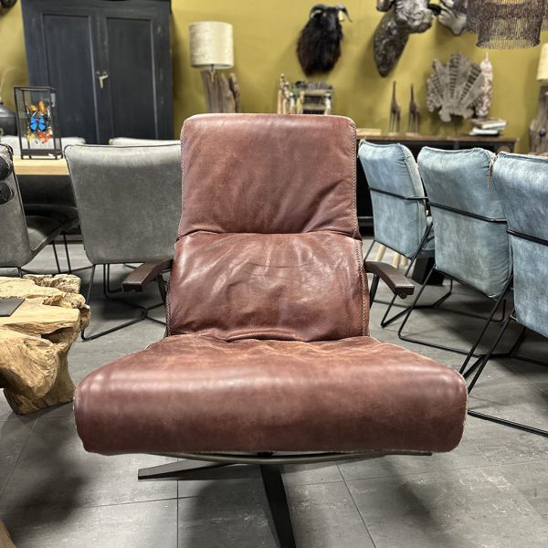 Deze draaifauteuil is te leveren in verschillende kleuren leder en verschillende stoffen.