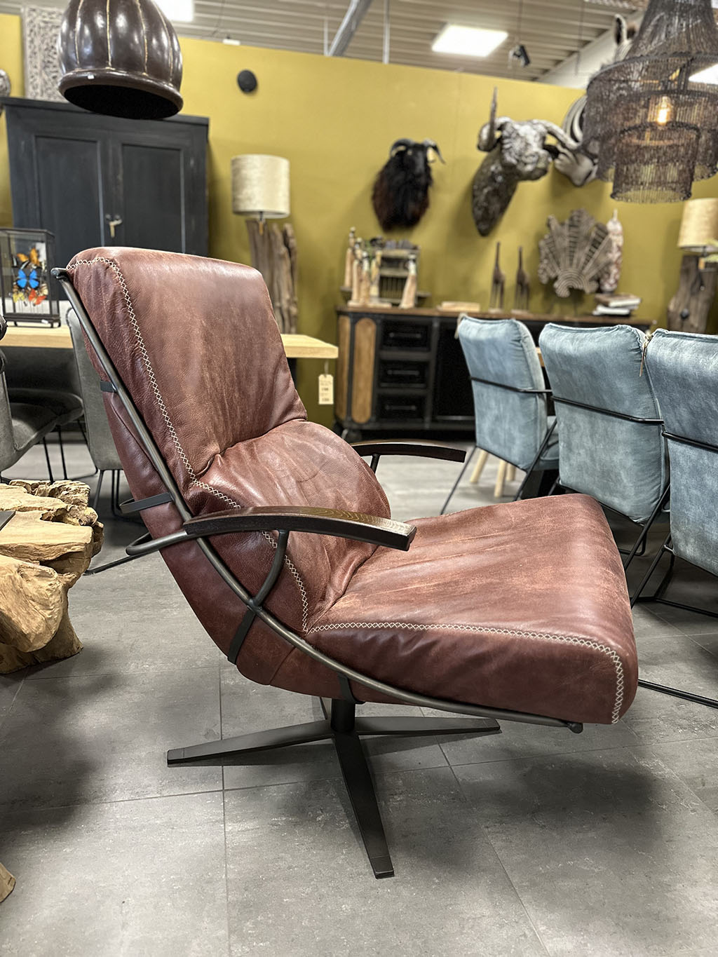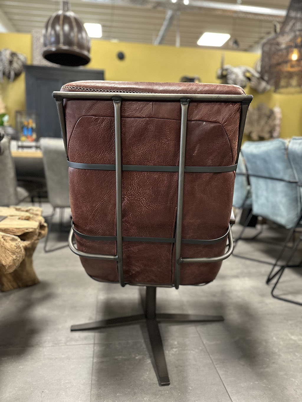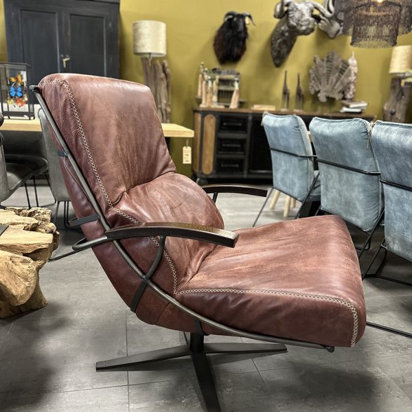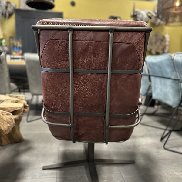 Het leren kussen ligt in een stoer metalen frame.