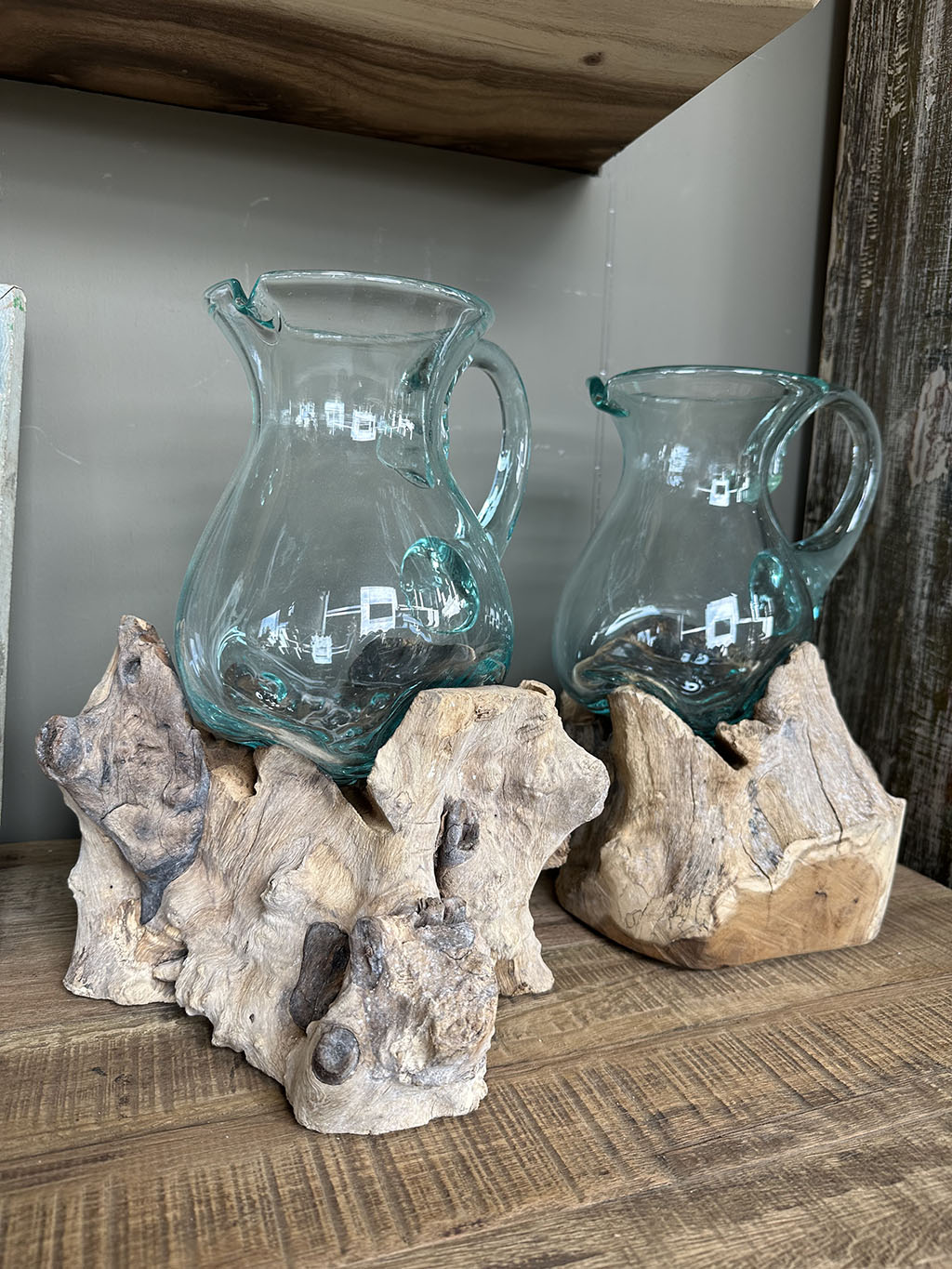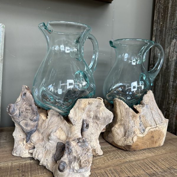Stuk voor stuk uniek zijn deze handgeblazen glazen op grillige houten stronken. Het glas wordt heet op de stronk geplaatst, waardoor het er volledig omheen vormt en elke vorm anders is.