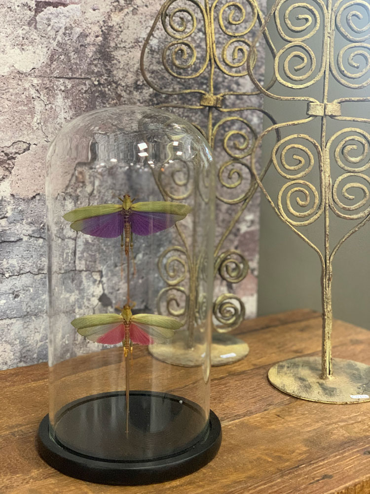 Deze bijzondere stolp met tropische sprinkhanen is een echte blikvanger in je interieur. De insecten zijn zorgvuldig gepresenteerd onder een glazen stolp, wat zorgt voor een rustige en bijna museale uitstraling.