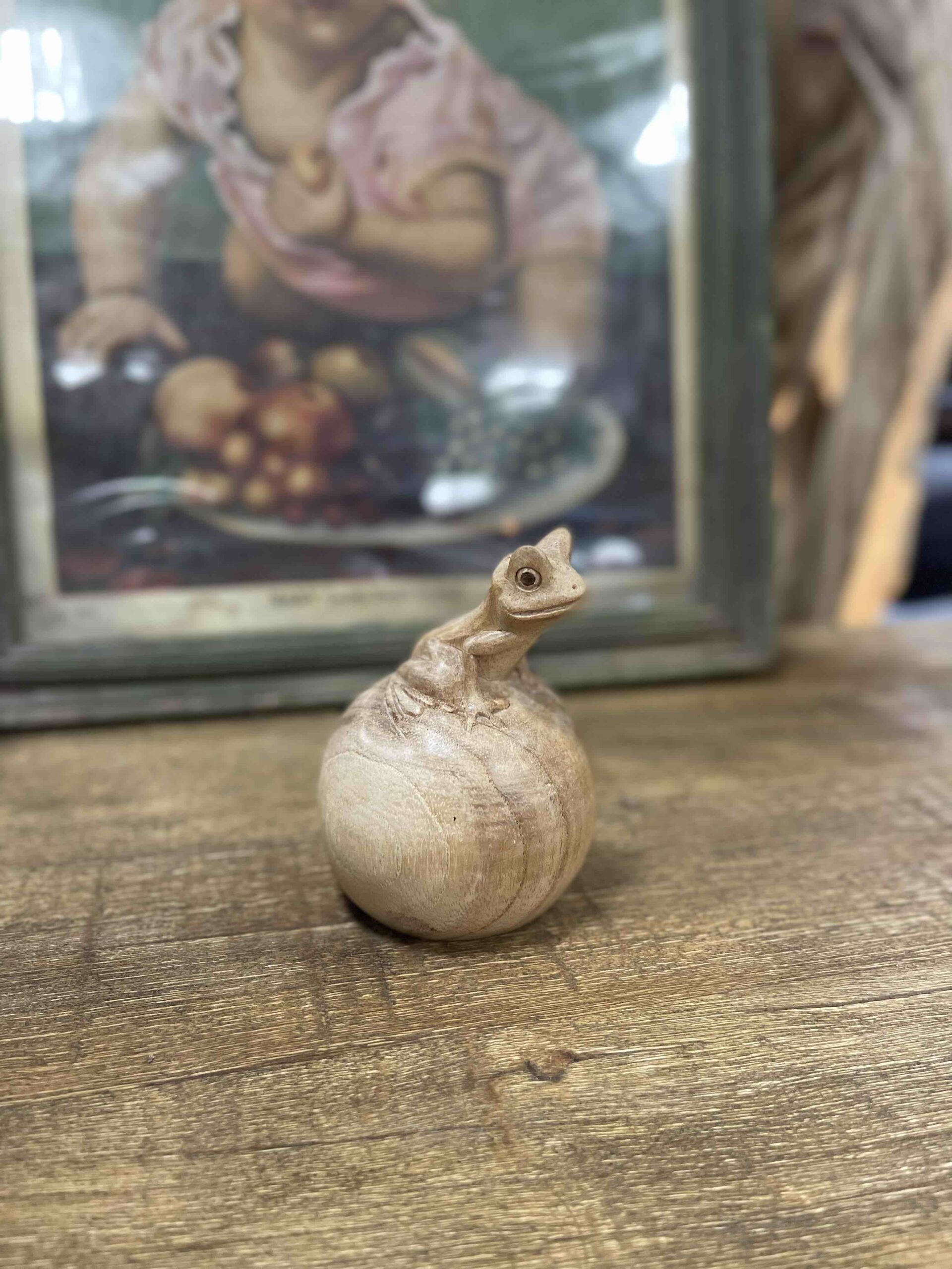 Deze kikker op bol is gemaakt uit één een stuk hout.