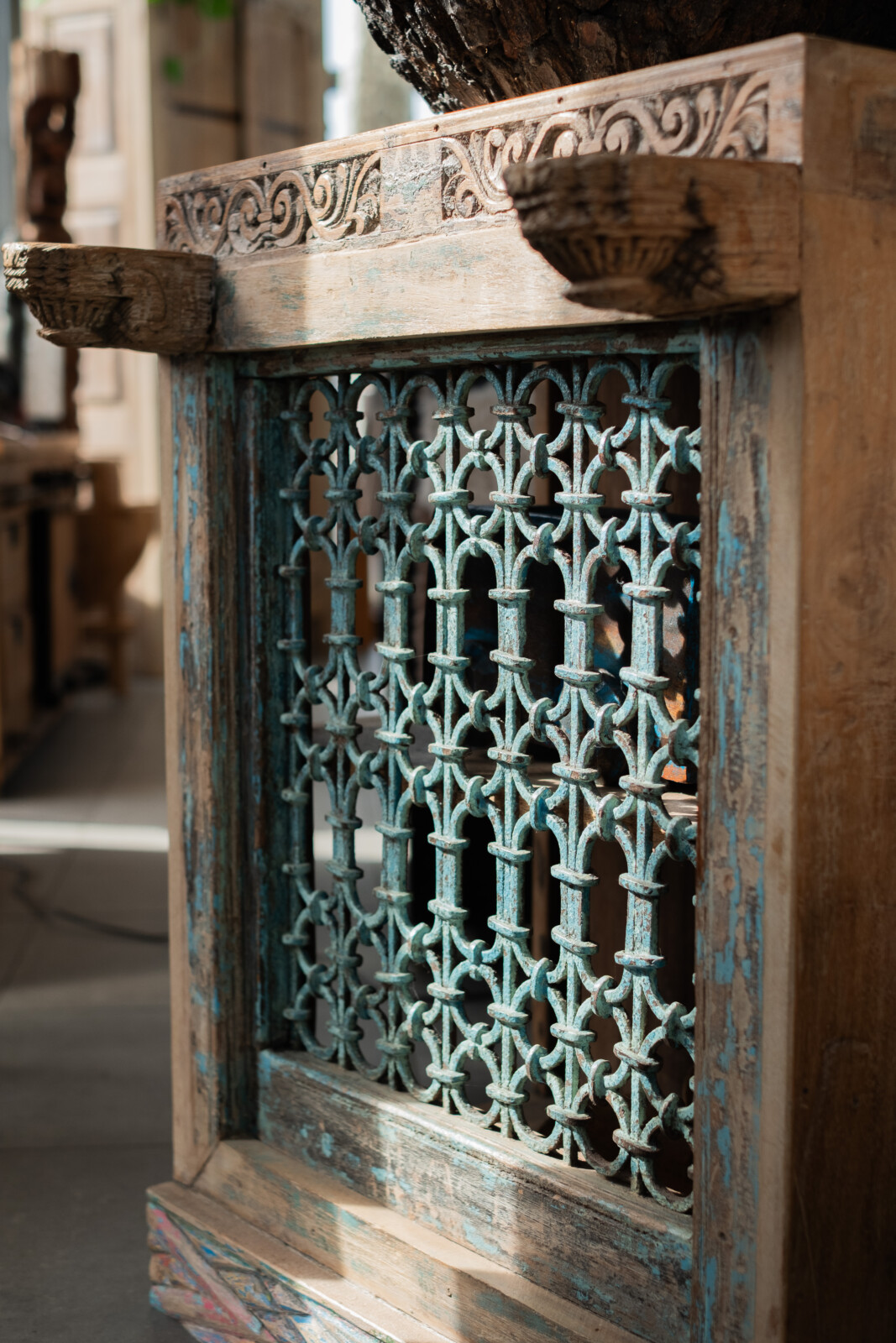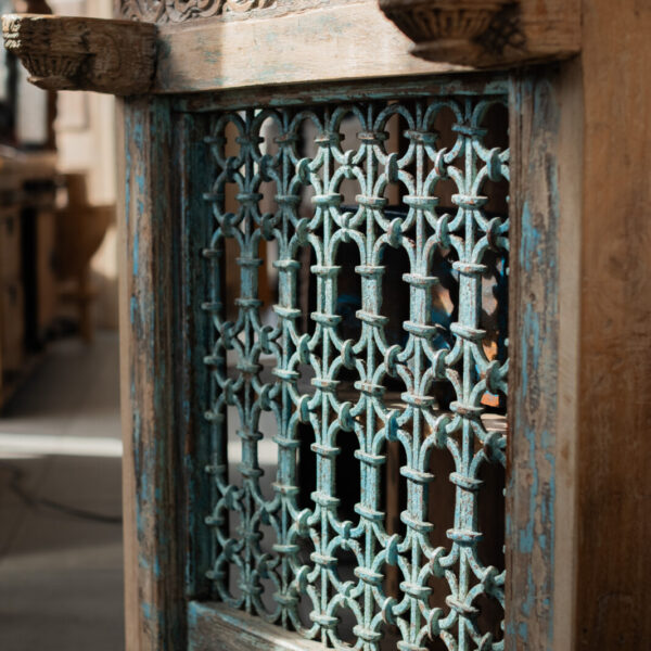 De Kiran dressoirkast is een compact en functioneel meubel met een karaktervolle uitstraling. De kast is gemaakt van hout en voorzien van een metalen front met een verfijnd patroon, wat zorgt voor een uniek detail binnen het geheel.