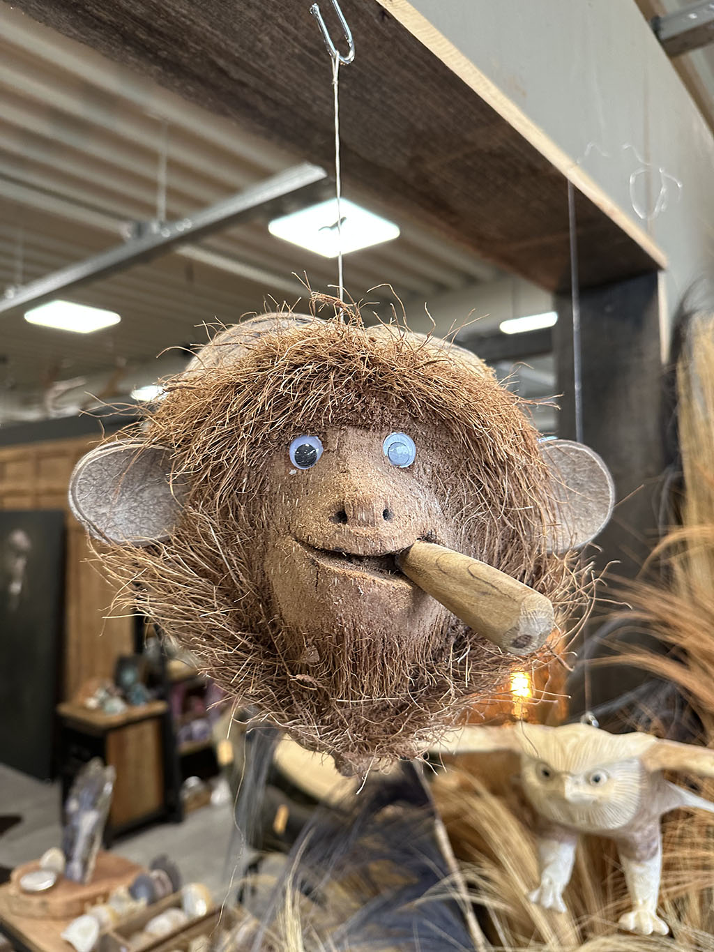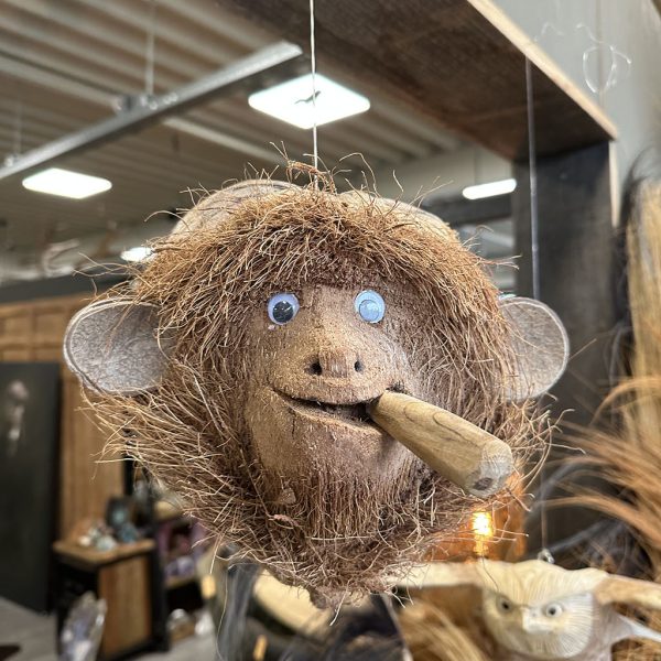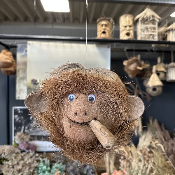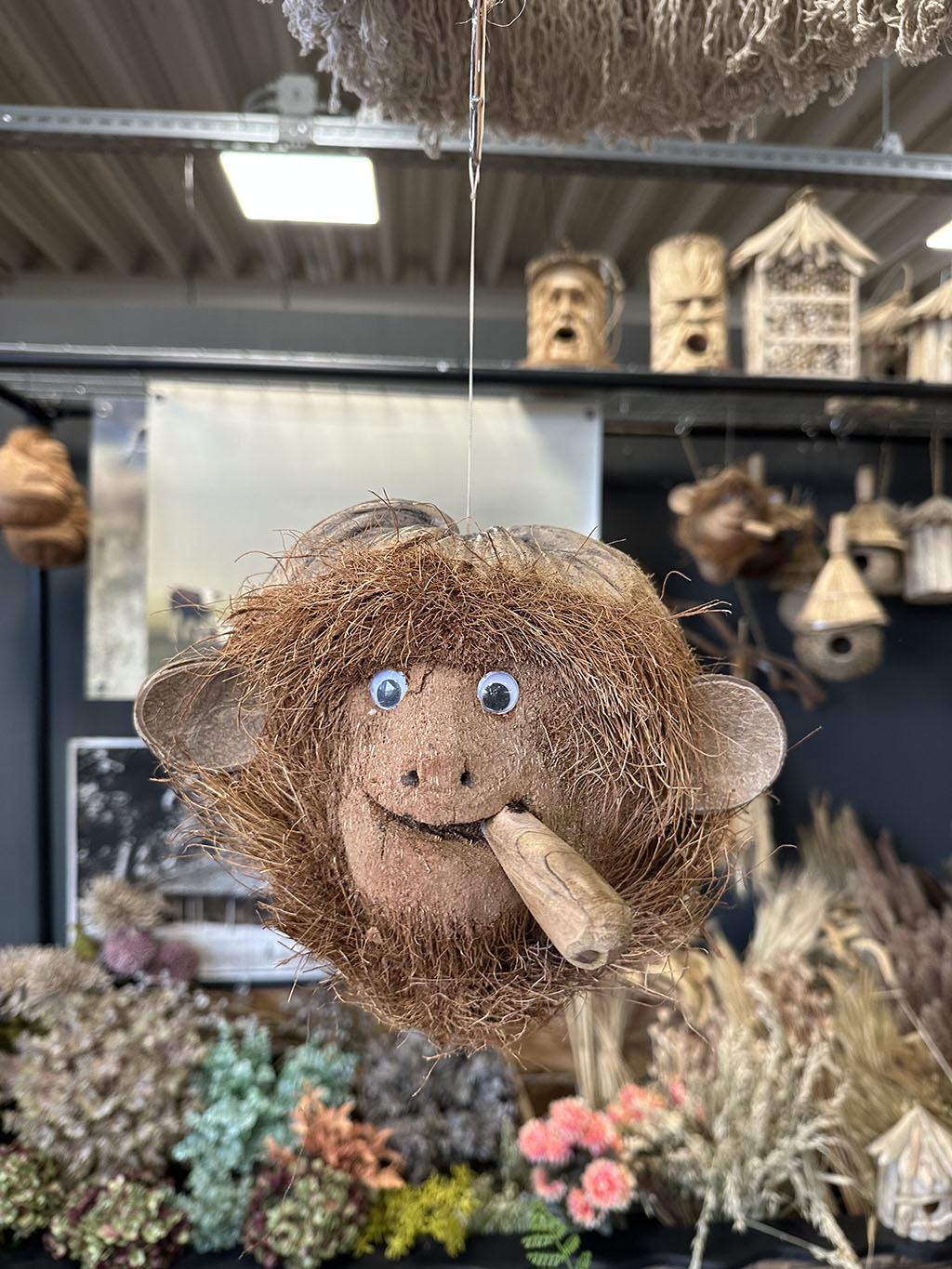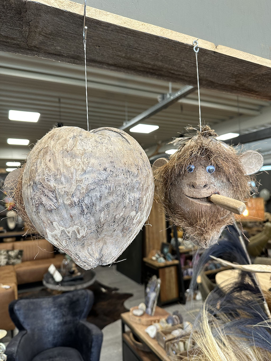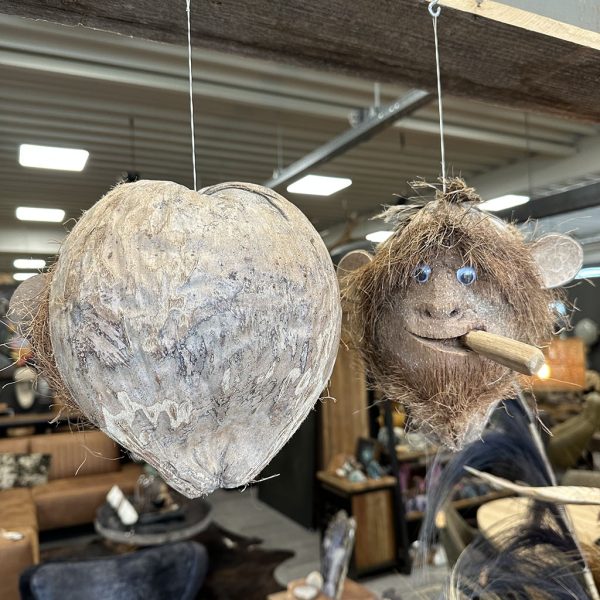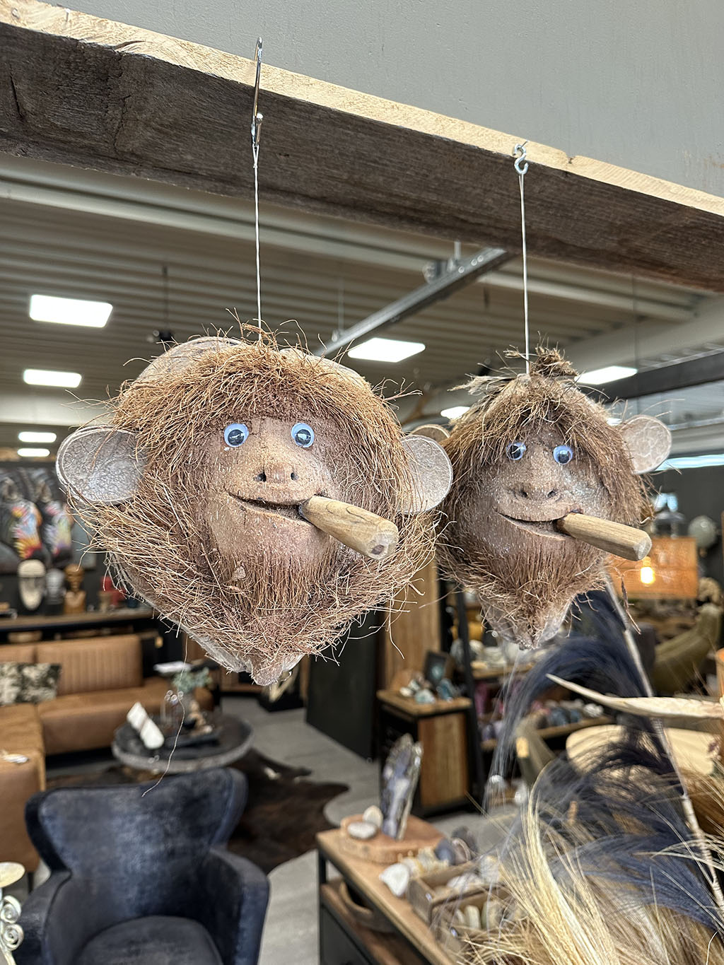 De aapjes zijn gemaakt van kokosnoten en verschillen doordat elk aapje een ander kapsel heeft.