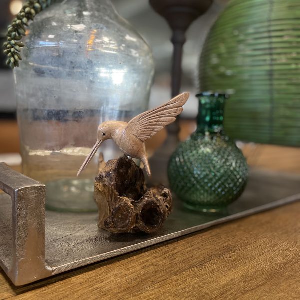 Deze kolibrie is op een grillig stukje hout gezet.