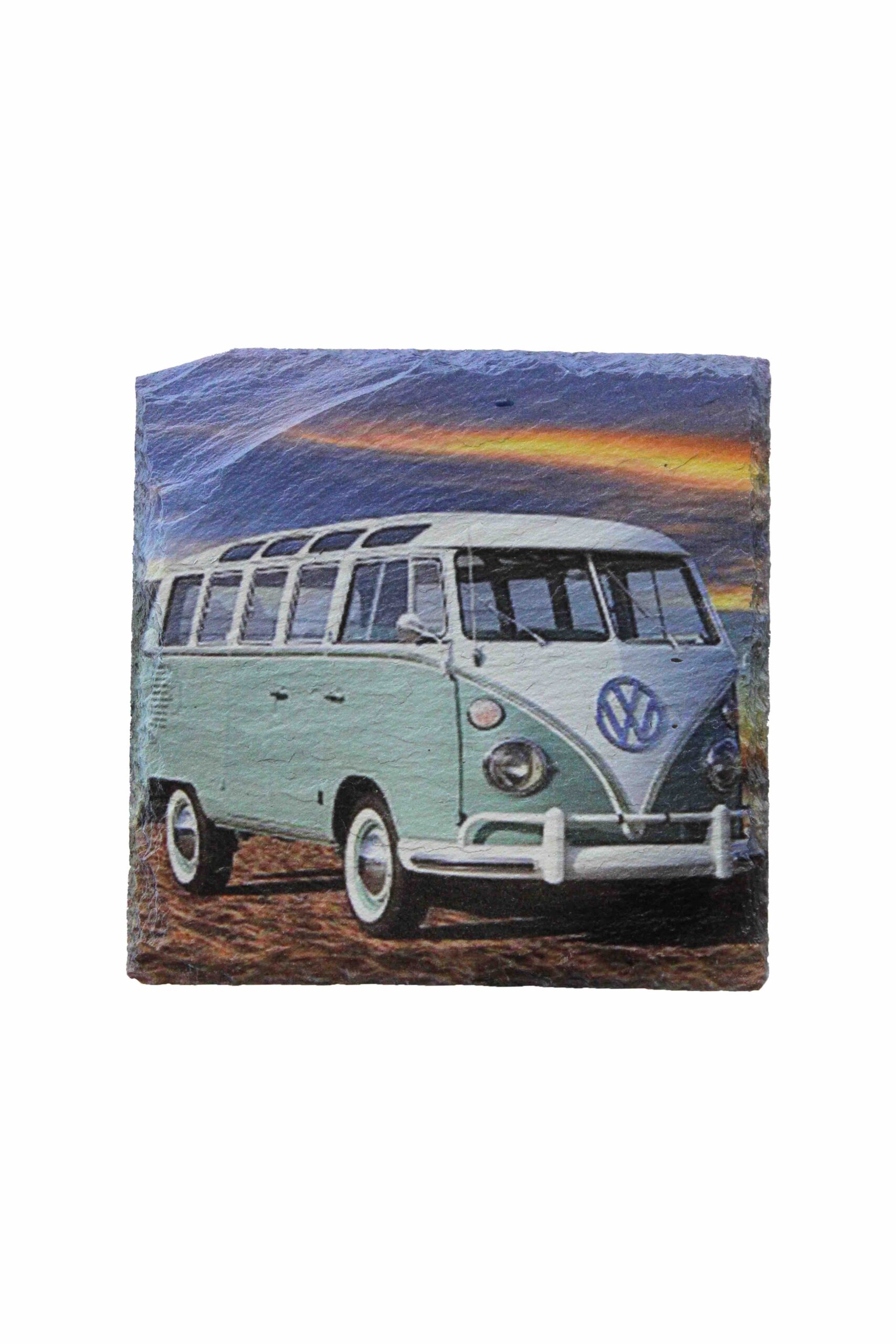Wil je eens een andere onderzetter dan normaal dan is deze leistenen onderzetter met Volkswagen busje mint groen een blikvanger voor op tafel! We hebben deze onderzetters in verschillende uitvoeringen. Niet alleen kunnen ze dienstdoen als onderzetter, maar zet ze in een houder en je hebt een leuk schilderijtje op je kast.