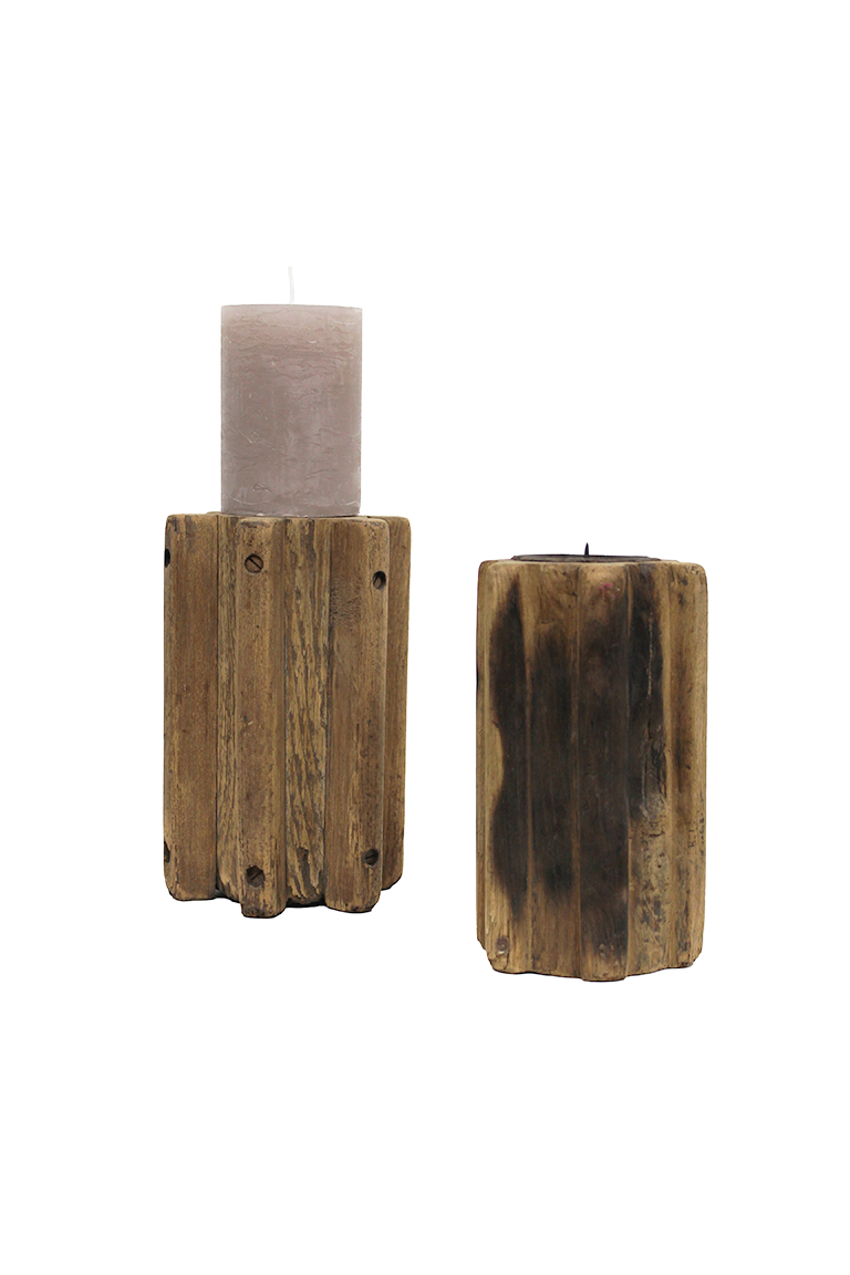Deze licht houten kaarshouder is gemaakt van oude pilaren.