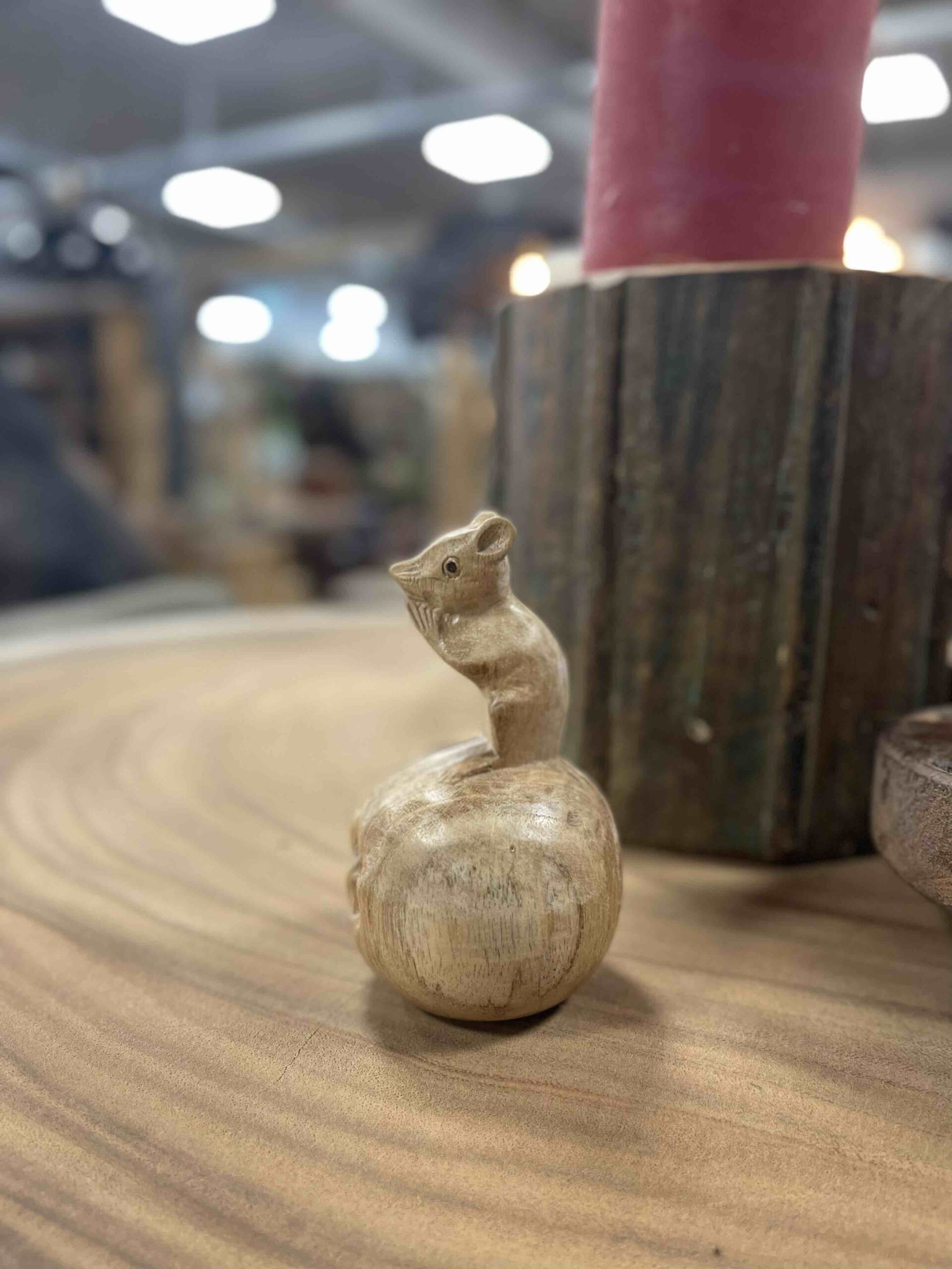Dit muisje op bol is gemaakt uit één een stuk hout.
