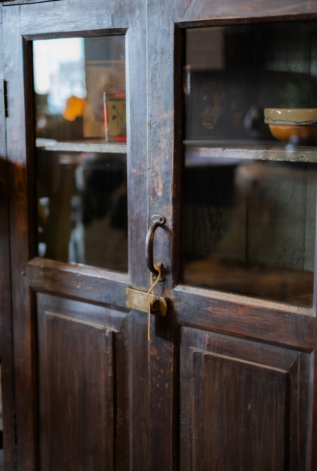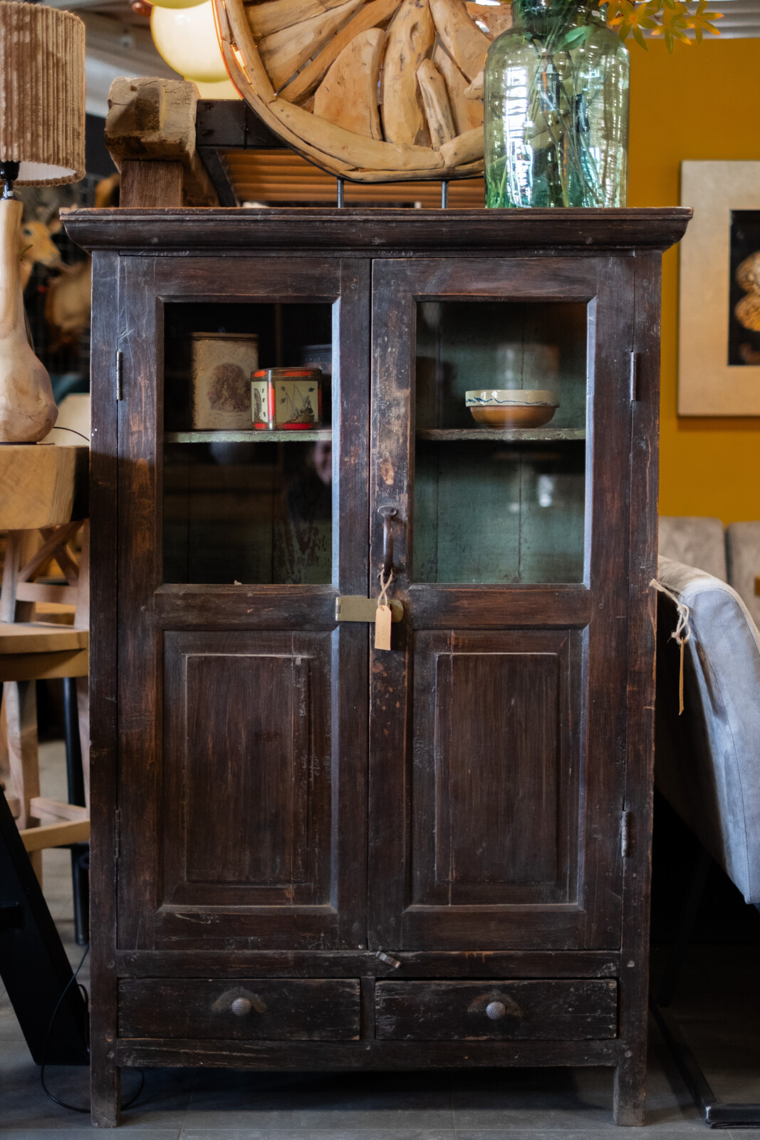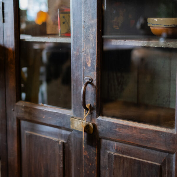 De Saathi vitrinekast is een functionele kast met een authentieke en doorleefde uitstraling. De combinatie van glazen bovenpanelen en dichte onderdeuren maakt deze kast geschikt voor zowel het presenteren als het opbergen van diverse items.