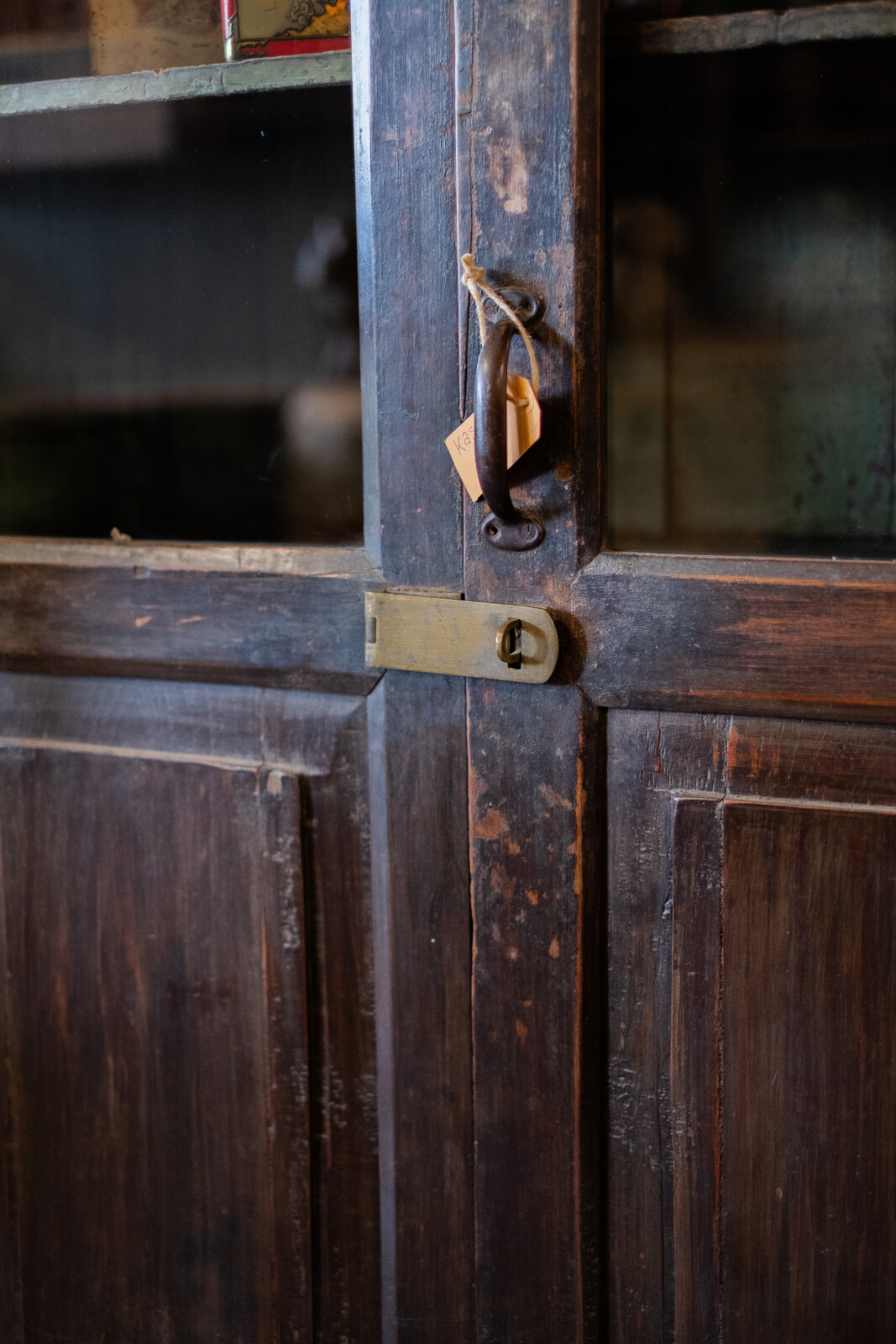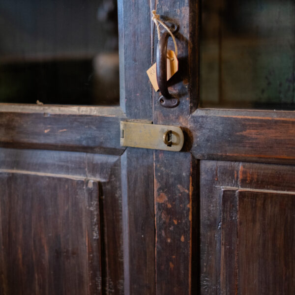 De kast is gemaakt van oud hout en heeft een donkere, verweerde afwerking. De zichtbare gebruikssporen en kleurverschillen geven het meubel een karaktervolle uitstraling.