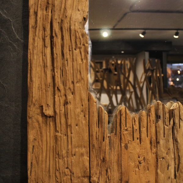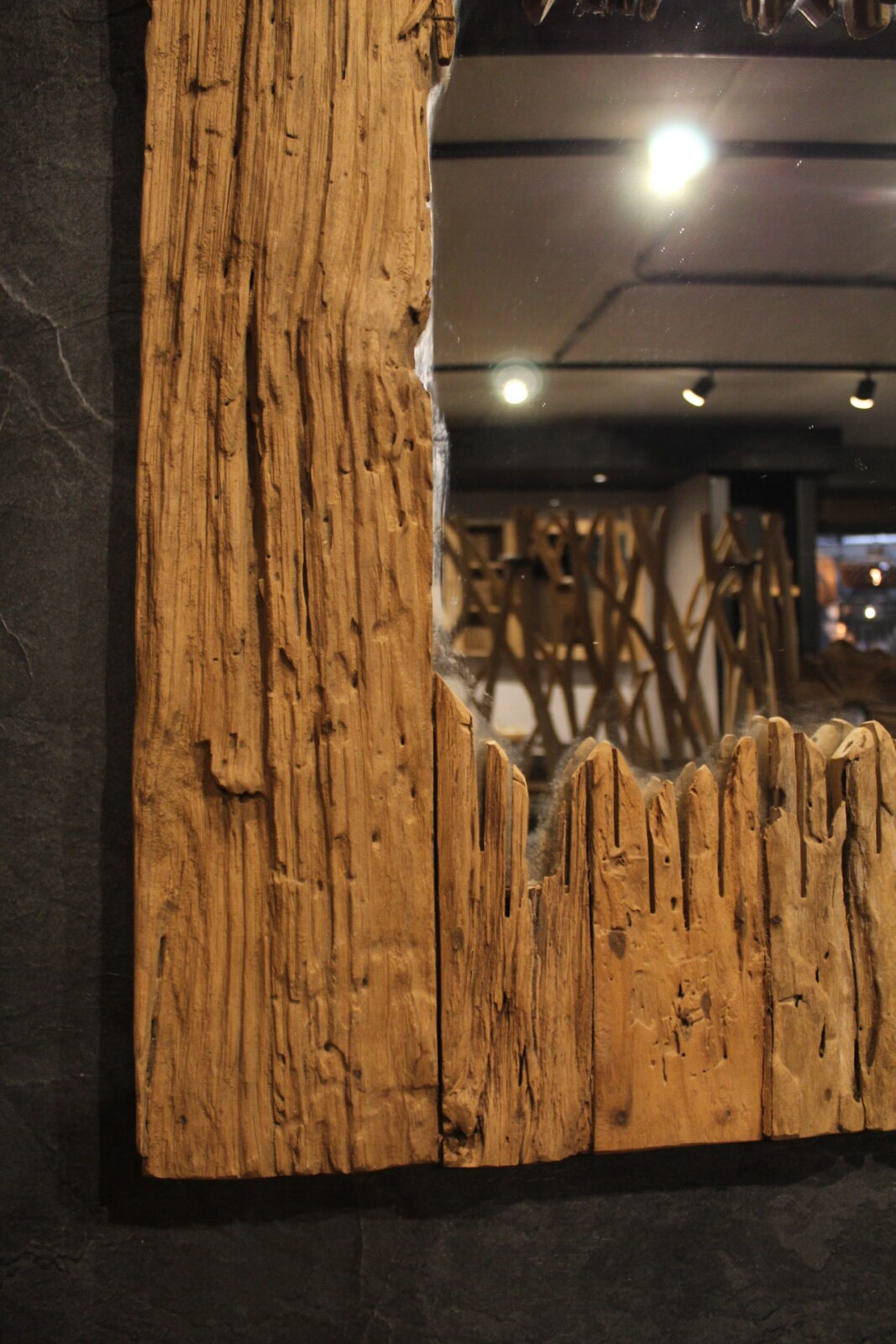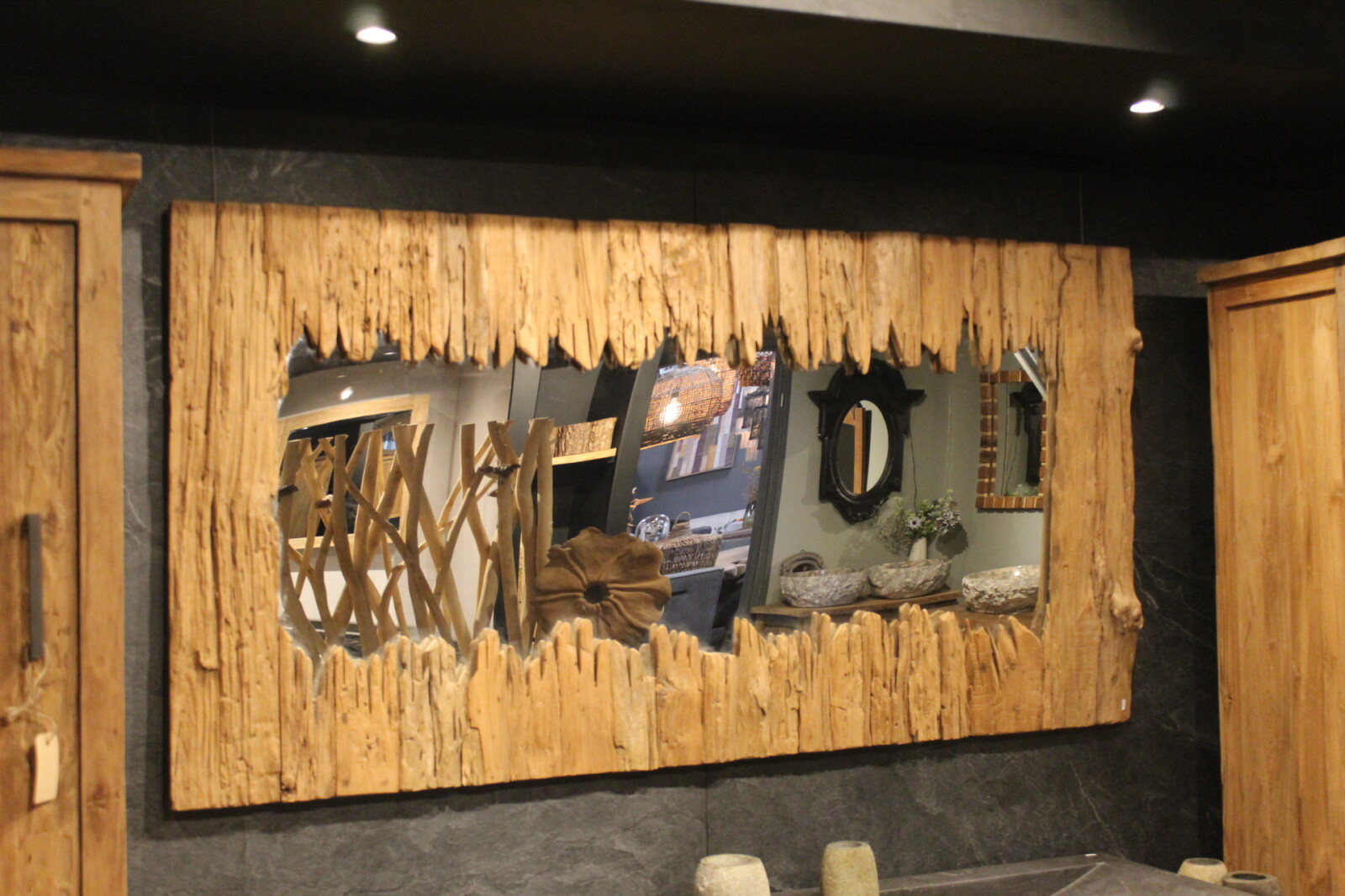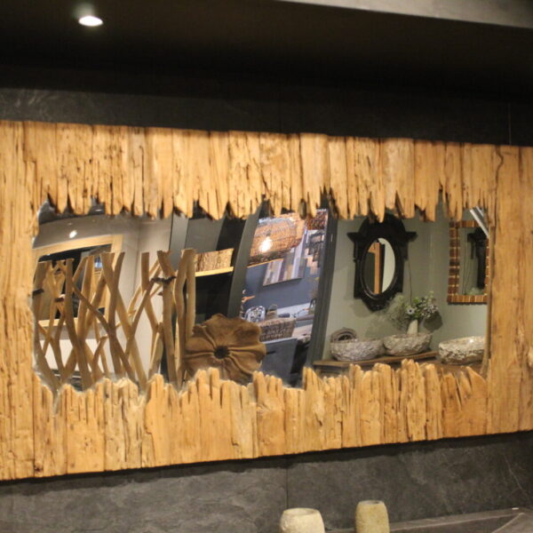 De Samar spiegel is een opvallende wandspiegel gemaakt van massief suar hout. De grillige, uitgesneden rand volgt de natuurlijke lijnen van het hout en geeft deze spiegel een krachtig en uniek karakter.