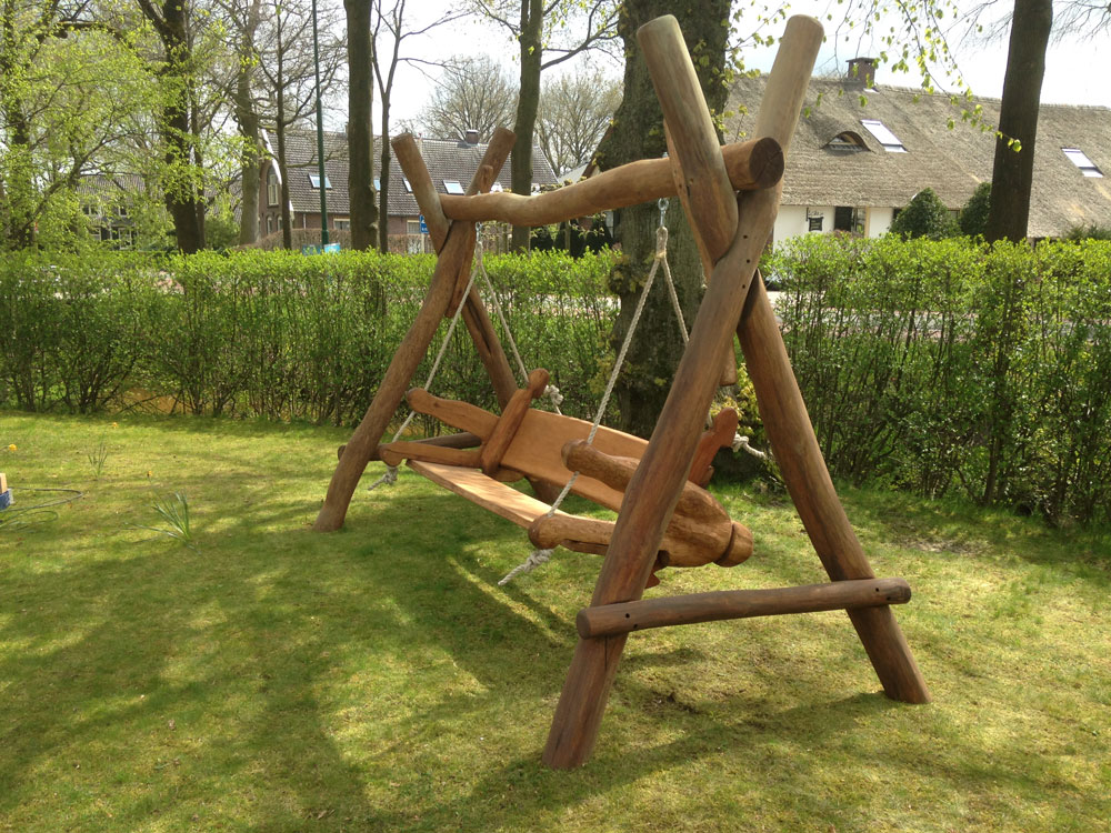 Voor de banken is de natuurlijke vorm van het hout behouden. Daardoor krijgt iedere schommel zijn eigen karakter.