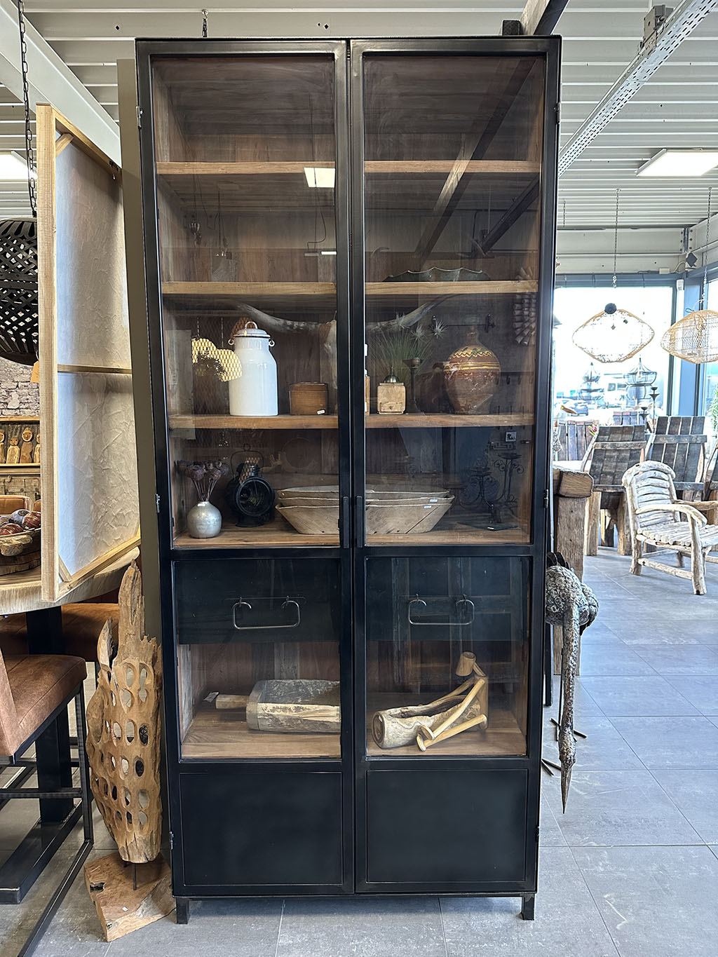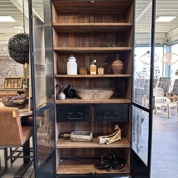 Deze servieskast bestaat uit twee open glazen deuren waardoor u uw favoriete spullen zoals vlinders, oud aardewerk of een mooie Boeddha kunt tonen.