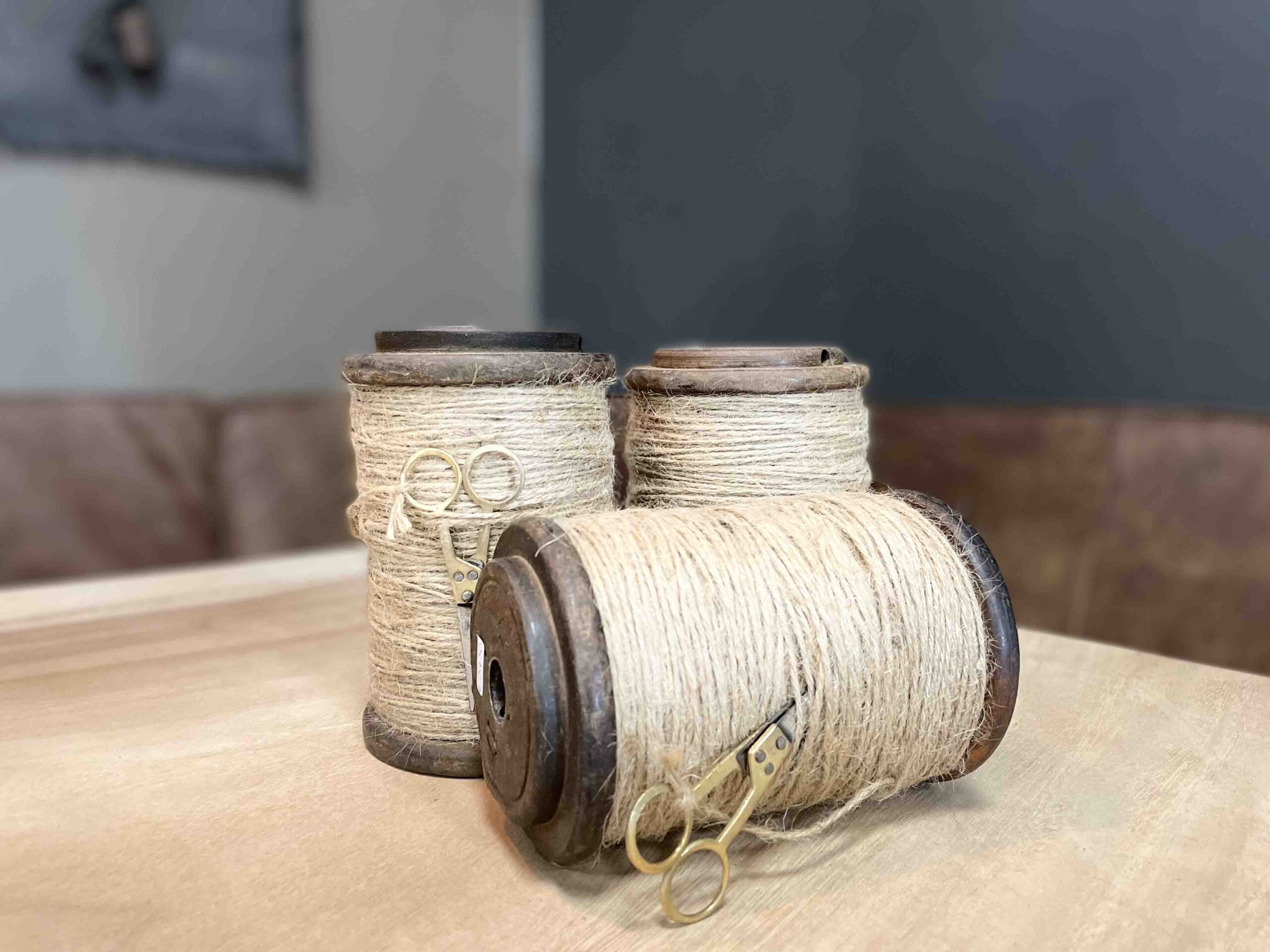 Dit zijn oude spoelen uit India met het oude sisal garen er nog op. Het schaartje zit er zelfs nog bij.