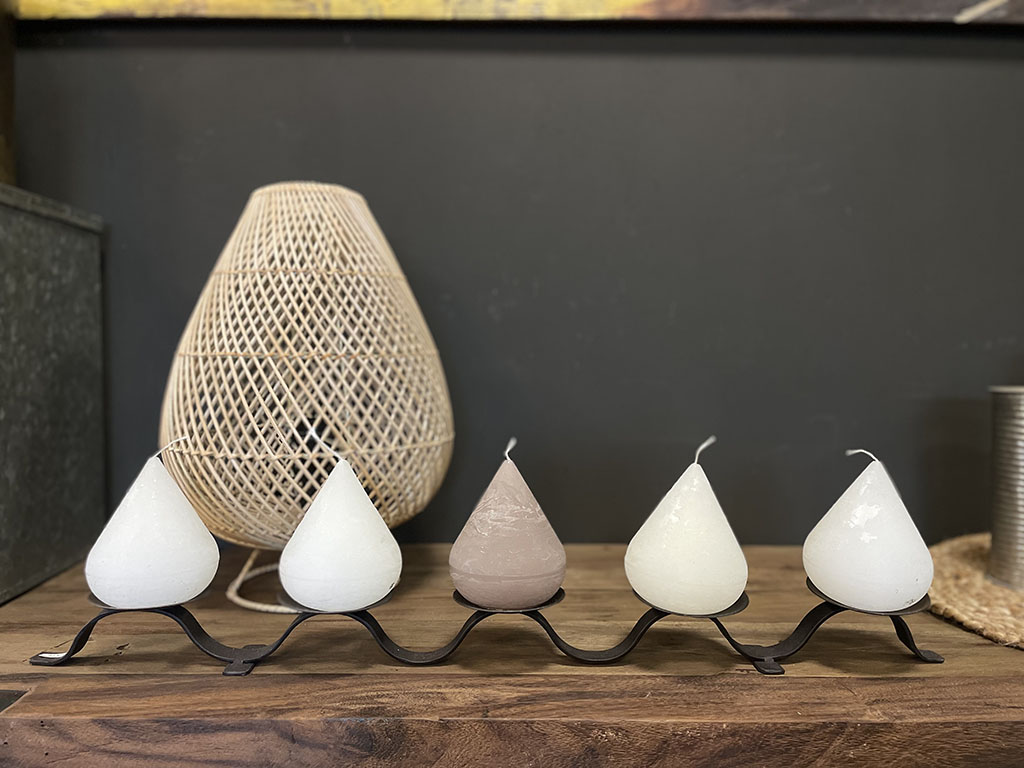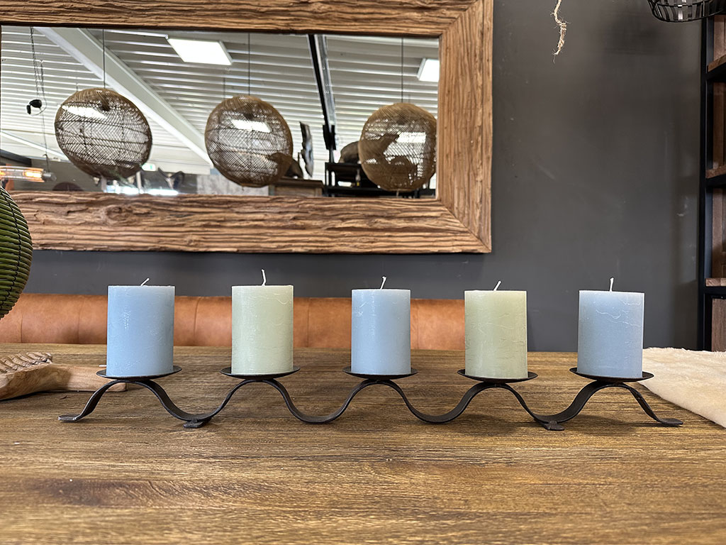 Zet hem in de kamer met allemaal dezelfde stompkaarsen of op een dressoir met kaarsen in verschillende kleuren en verschillende hoogtes.