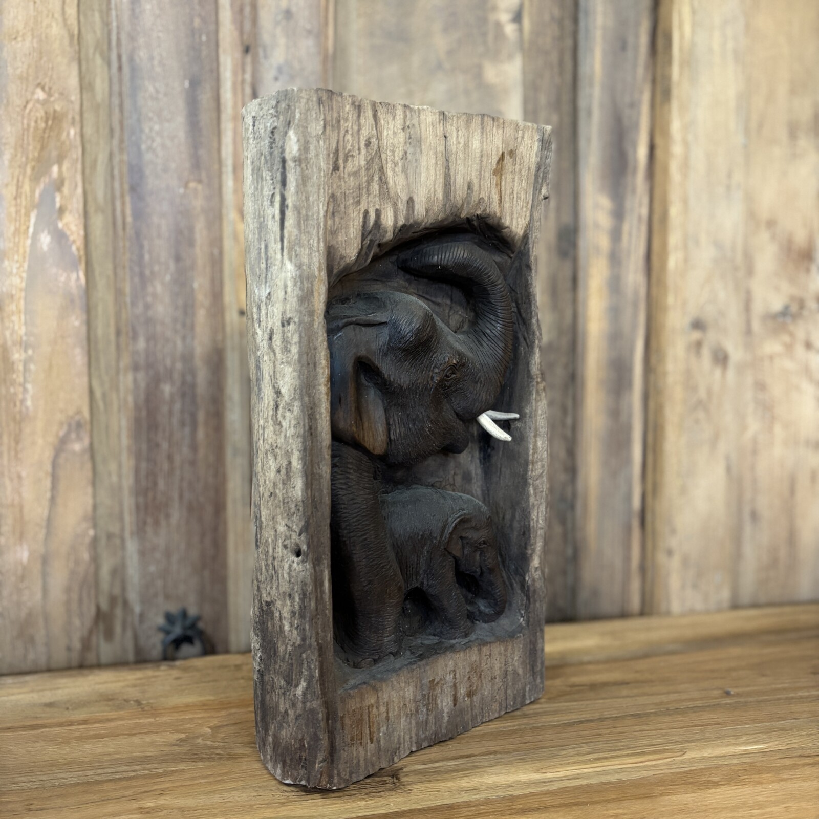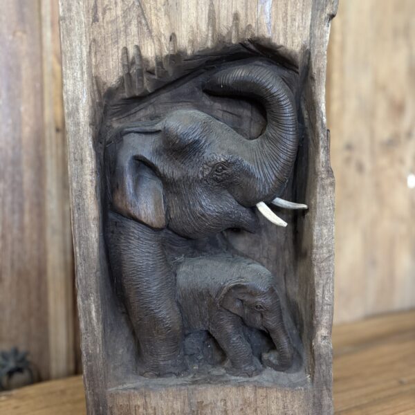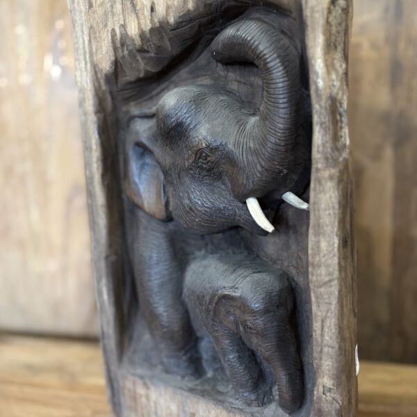 Dit olifantenbeeld is gemaakt van suar hout en verwerkt in een stuk boomstam. De olifant is in het hout uitgesneden, waardoor er een mooi diepte-effect ontstaat.