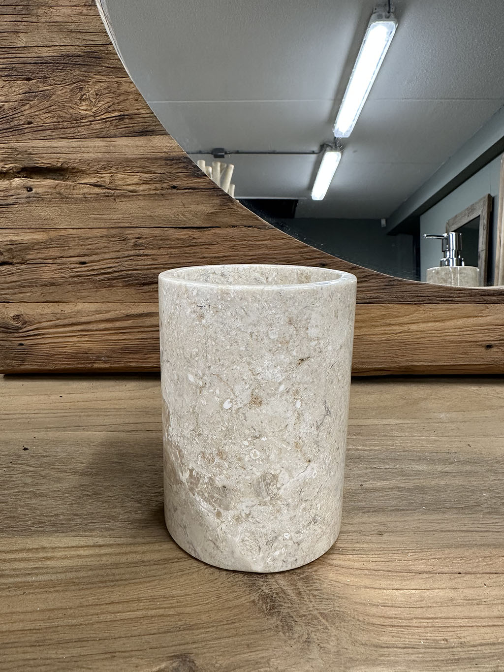 Deze tandenborstelbeker is gemaakt van wit marmer.