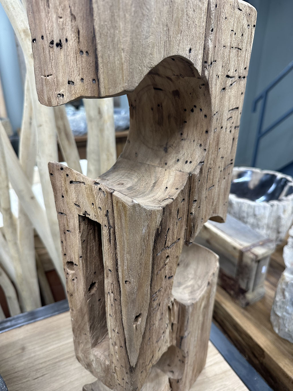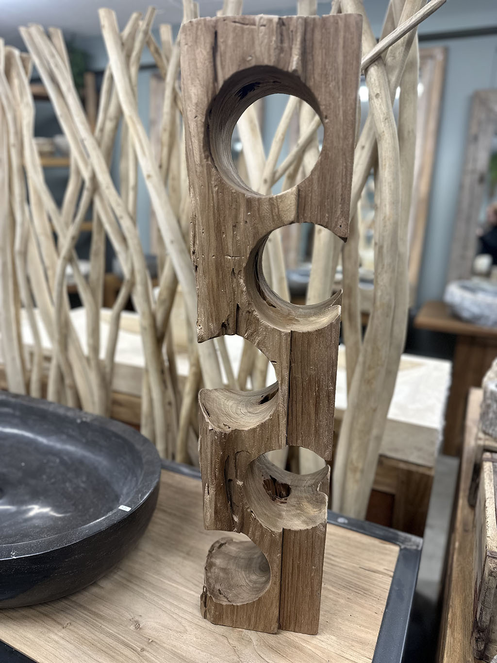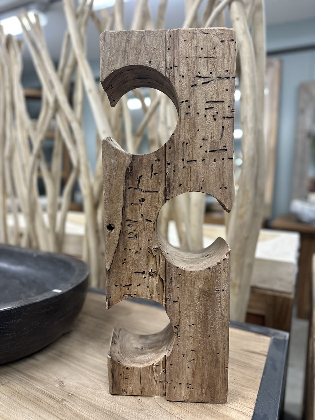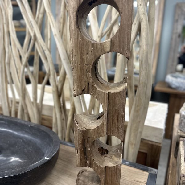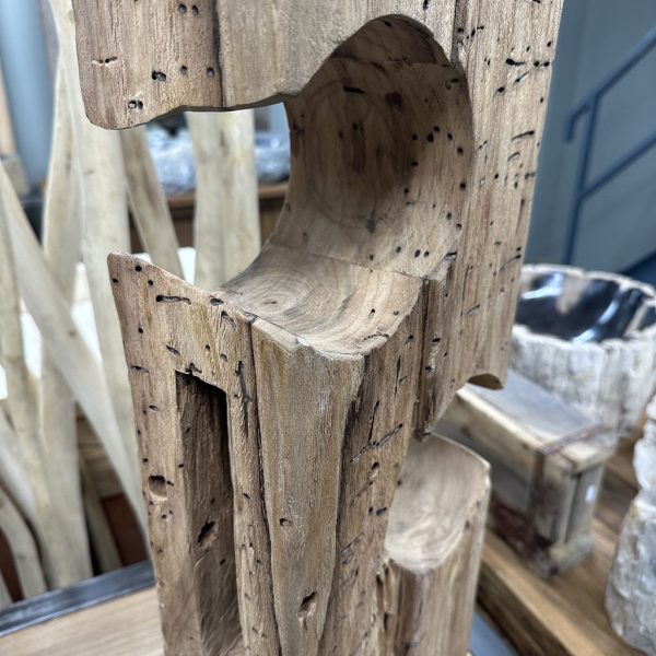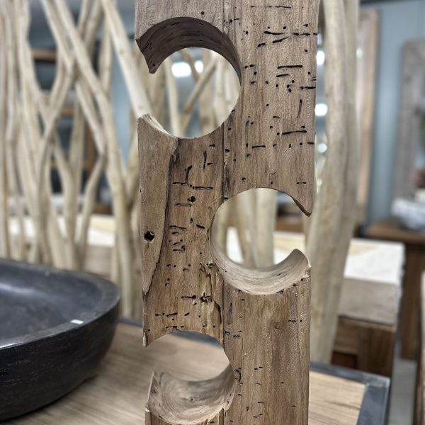 De houder is gemaakt van gebruikt massief teakhout, waardoor elk exemplaar een unieke, robuuste uitstraling heeft met zichtbare houtstructuren en karaktervolle details.