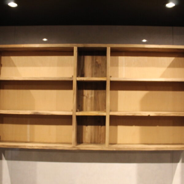 De kast is gemaakt van massief hout en heeft een warme, natuurlijke uitstraling. De open vakken in het midden bieden ruimte voor het opbergen van kleine accessoires zoals verzorgingsproducten of decoratieve items.