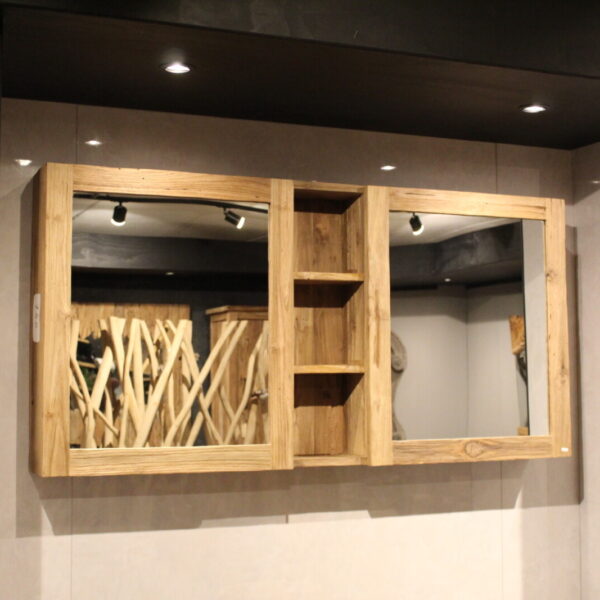 De Vira spiegelkast combineert functionaliteit met een natuurlijke uitstraling. Deze houten wandspiegel is voorzien van vakken waardoor je niet alleen een spiegel hebt, maar ook praktische opbergruimte.