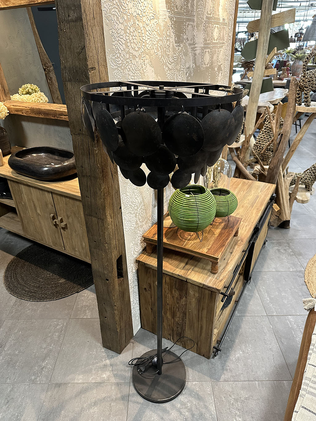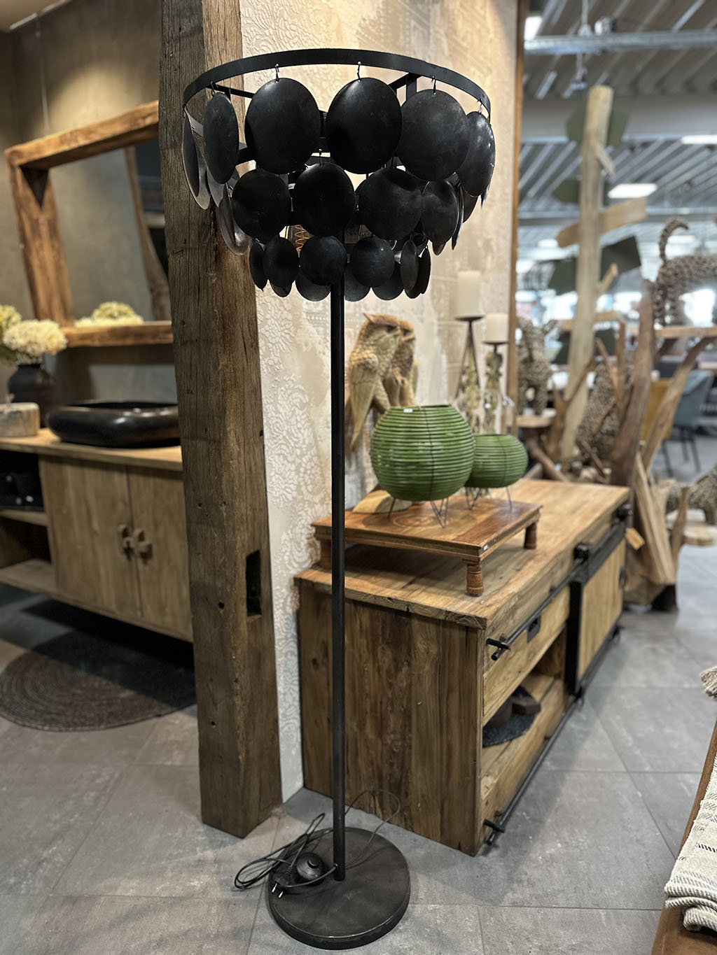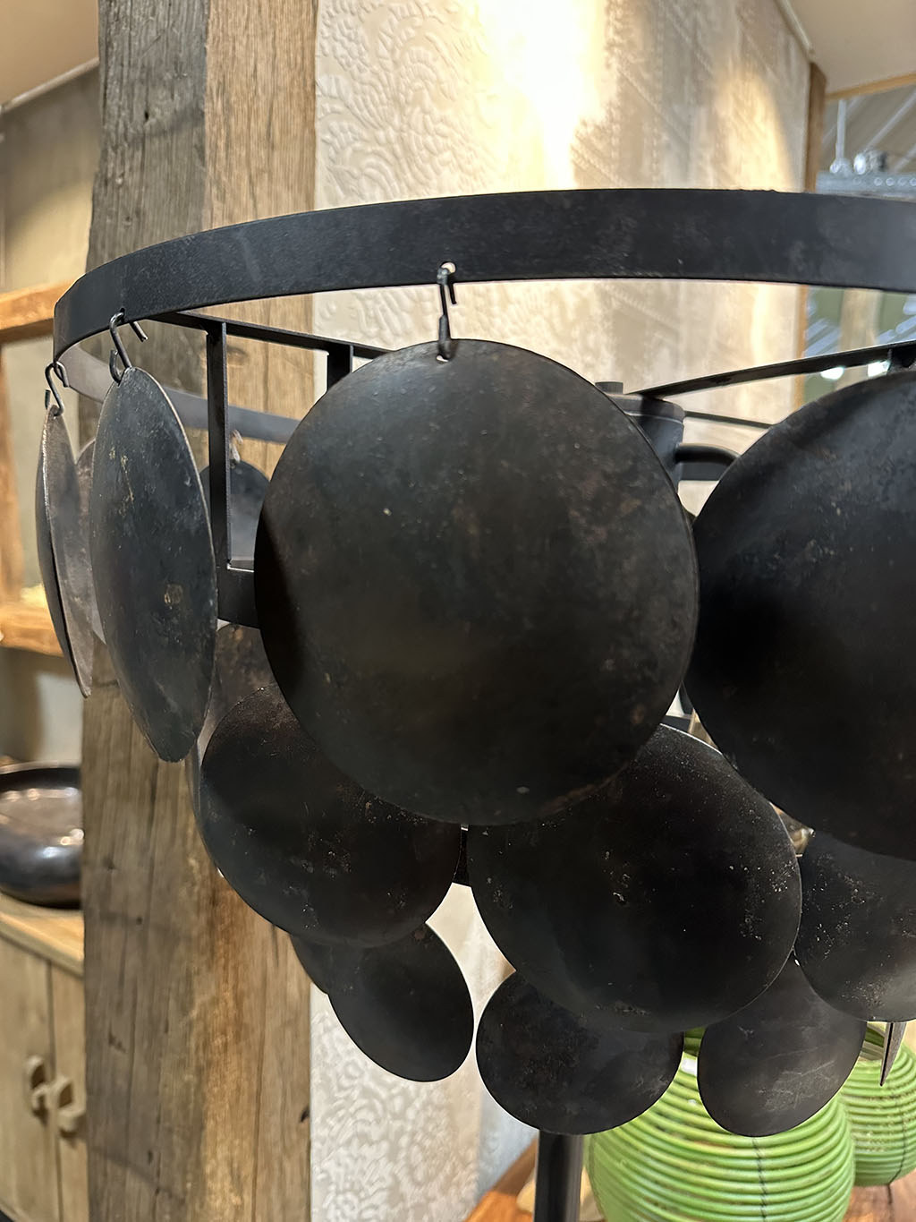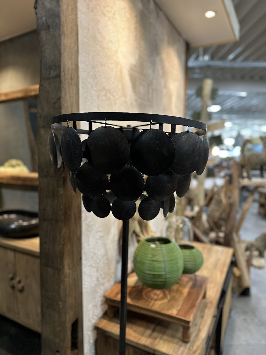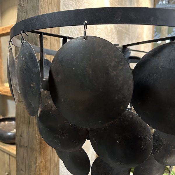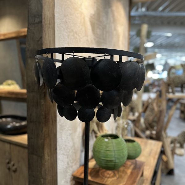 De kap is gemaakt van allemaal zwarte, stalen, ronde plaatjes bevestigd op een stoer stalen frame.