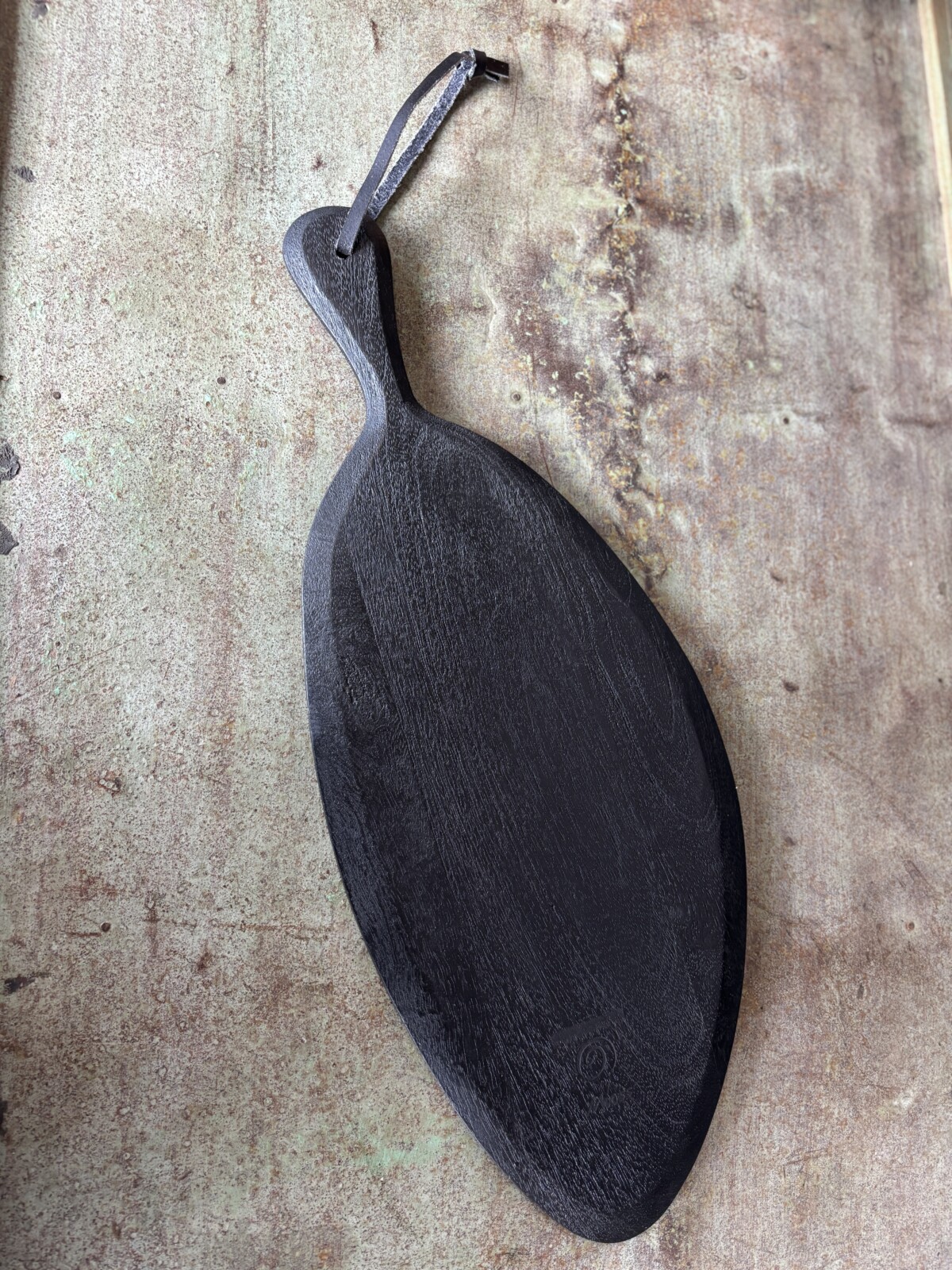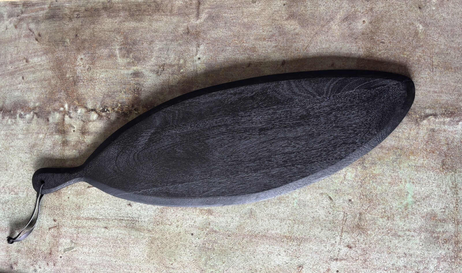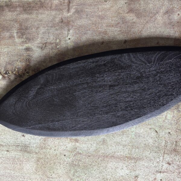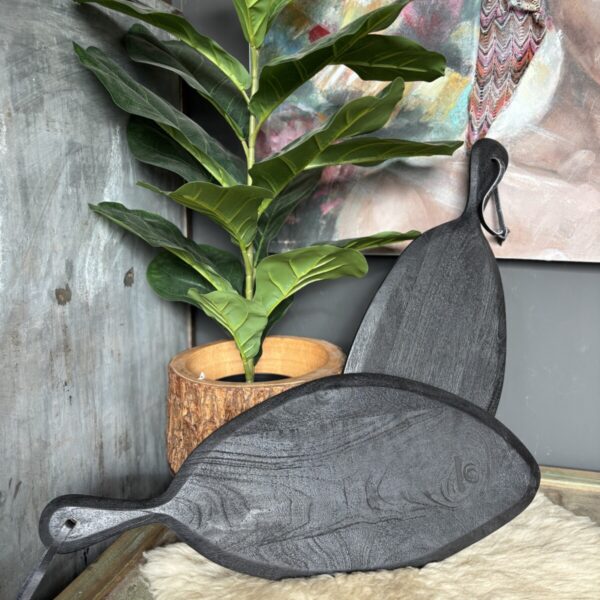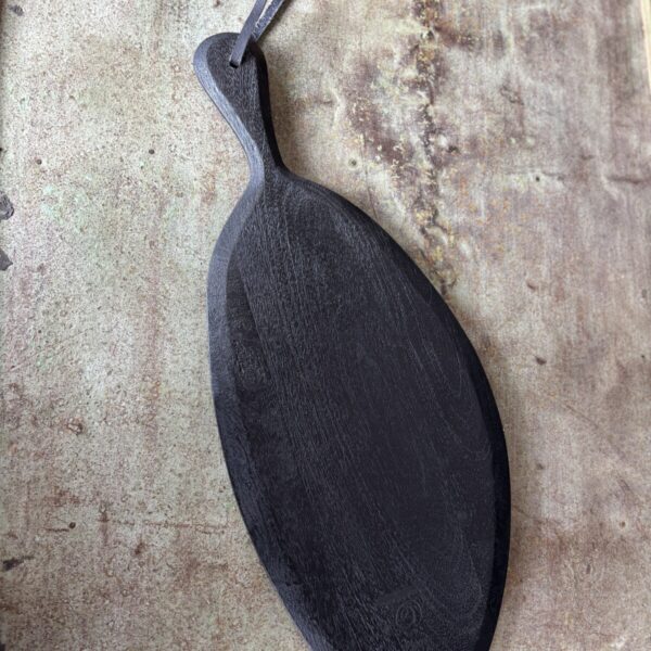 Deze zwarte tapasplank is een praktische en decoratieve toevoeging voor het serveren van hapjes. De organische vorm en donkere afwerking geven de plank een stoere en moderne uitstraling.